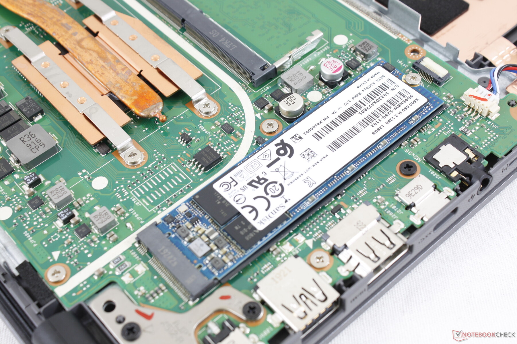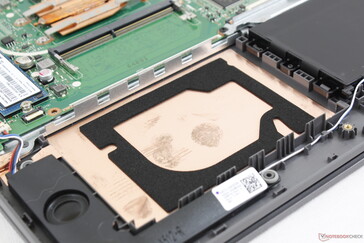 Das Entfernen der Bodenplatte ist mit wenig Aufwand verbunden, da hierfür nur ein Kreuzschraubenzieher benötigt wird. Im Inneren befinden sich ein SODIMM- und ein M.2-2280-Steckplatz. Auf unserem Bild sieht man die großen, ungenutzten Räume neben dem Akku und dem Lüfter.