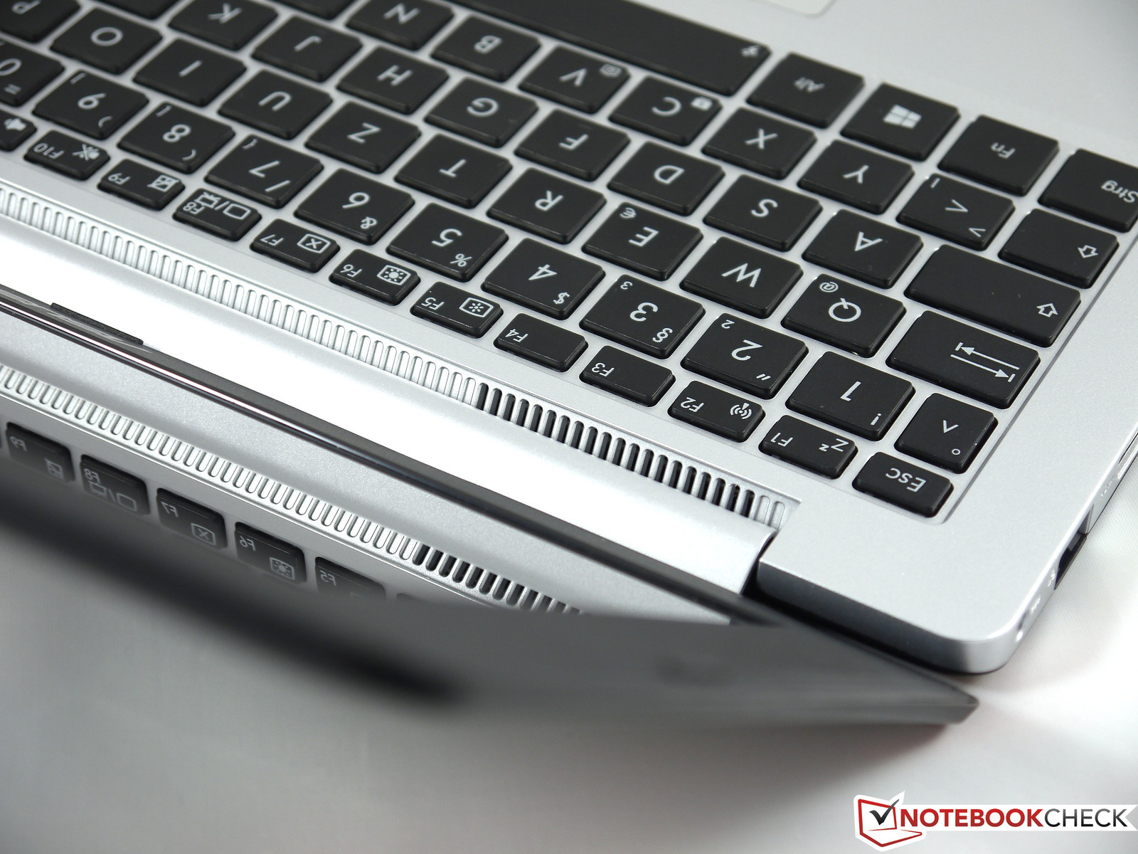 Die Tasten des X201E sind mit 15 x 13,3 Millimetern für ein 11,6 Zoll großes Notebook sehr großzügig bemessen. Der Schreibkomfort ist dementsprechend ebenfalls als gut zu bezeichnen, da die Hände beim Schreiben nicht gegeneinander gedrückt werden müssen. Der Tastenhub ist eher gering, der Druckpunkt jedoch trotzdem deutlich und knackig. Zudem ist das Anschlaggeräusch angenehm leise und auch ein Durchbiegen des Tastaturbetts konnten wir durch härteren Druck nicht hervorrufen.