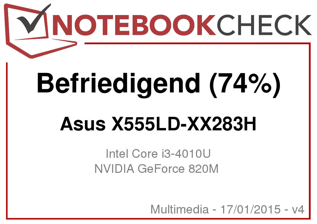 Das Asus X555LD-XX283H stellt einen preiswerten Allrounder im 15,6-Zoll-Format dar. Die Rechenleistung reicht für den Alltagsbetrieb mehr als aus. Zudem können - in eingeschränktem Maße - Computerspiele gespielt werden. Gelegenheitsspieler sollte die Spieleleistung zufrieden stellen. Zudem erwärmt sich der Rechner kaum und kann mit ordentlichen Akkulaufzeiten aufwarten. Die Tastatur des Rechners reicht für den Hausgebrauch aus. Vieltipper können mit ihr nicht viel anfangen. Das verbaute Display hinterlässt einen zwiespältigen Eindruck: Zum einen liefert es eine gute Farbdarstellung und einen ordentlichen Kontrast, zum anderen hat es nur eine sehr geringe Helligkeit zu bieten.
