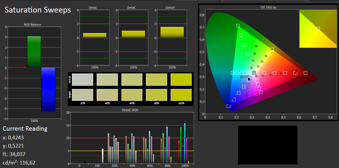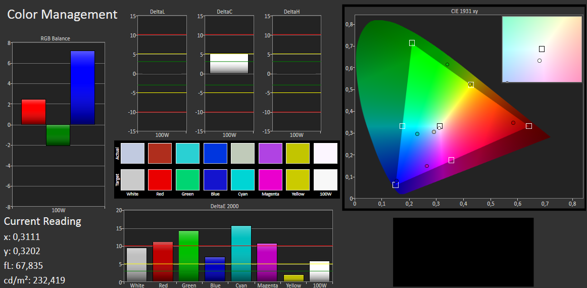 Im Auslieferungszustand haben wir den Bildschirm vermessen (Zielfarbraum sRGB) und konnten dabei moderate bis deutliche DeltaE-2000-Abweichungen bei fast allen Farben feststellen. Lediglich Gelb liegt im Zielbereich (DeltaE kleiner 5). Das Display besitzt einen Blaustich.