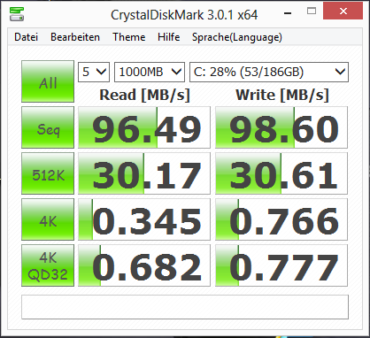 Asus bestückt das X55U mit einer Festplatte aus Hitachis Travelstar-Z5K500-Reihe, die eine Kapazität von 500 GB besitzt und mit 5.400 Umdrehungen pro Minute arbeitet. Wie bei Asus üblich ist die Festplatte in eine Betriebsystempartition (186 GB), eine Datenpartition (258 GB) und eine Recoverypartition (20 GB) unterteilt. CrystalDiskMark meldet eine Lesegeschwindigkeit von 96,49 MB/s. HD Tune liefert eine durchschnittliche Transferrate von 80 MB/s. Diese Werte gehen für eine 5.400er-Festplatte sehr in Ordnung. Die Zugriffszeit fällt mit 21,2 ms etwas hoch aus.