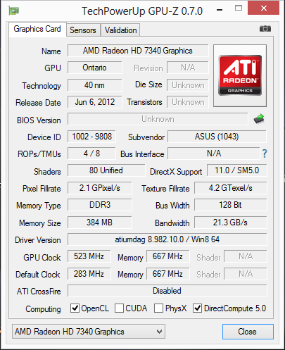 Die GPU des X55U ist Bestandteil der APU und trägt die Bezeichnung Radeon HD 7340. Dieser Grafikkern gehört der Einsteigerklasse an und unterstützt DirectX 11. Er arbeitet mit einer Basisgeschwindigkeit von 523 MHz. Eine Erhöhung auf bis zu 680 MHZ ist möglich (AMD Turbo Core).