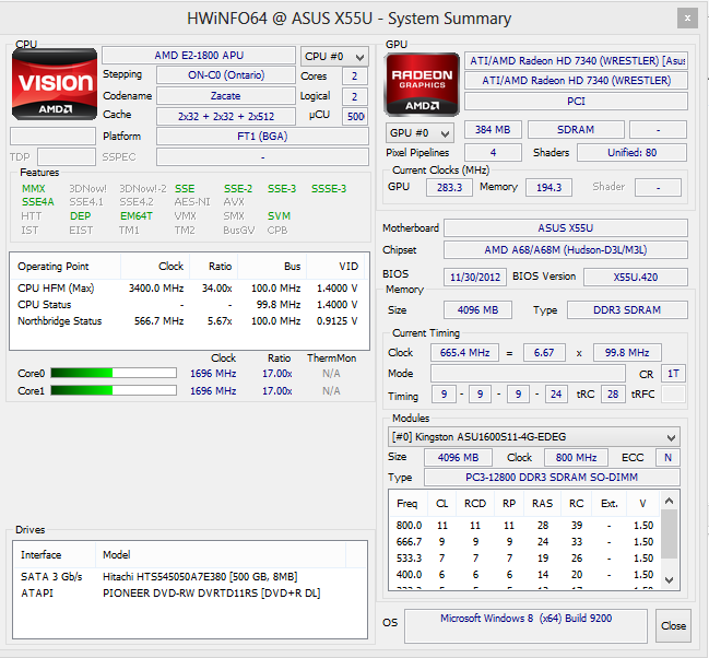 Asus verbaut in dem Rechner eine AMD E2-1800 APU. Der CPU-Teil der APU besteht aus einem Zweikernprozessor, der mit einer Geschwindigkeit von 1,7 GHz arbeitet. Einen Turbo gibt es nicht. AMD beziffert die TDP auf 18 Watt. Damit befindet sie sich etwa auf dem Niveau der ULV-Prozessoren von Intel (ca. 17 Watt). Leistungsmäßig liegt die APU aber weit hinter diesen Prozessoren zurück.