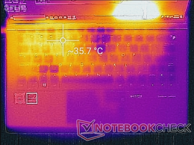 Im Leerlauf sind die Oberflächentemperaturen aufgrund der darunter positionierten Kühllösung in der Tastaturmitte am höchsten. Unter sehr hohen Lasten erwärmen sich die Oberflächen, die dem Prozessor am nächsten sind, mit 36 °C und 44 °C oben bzw. unten am stärksten. Diese heißen Stellen befinden sich glücklicherweise am hinteren Ende des Geräts, wodurch die Handballenablage und die QWERTY-Standardtasten bei der Benutzung nie unangenehm warm werden.