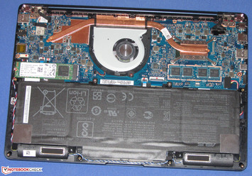 Die Wartung wird durch neun T5-Torx-Schrauben und zwei zusätzliche Kreuzschrauben, die unter den hinteren Gummifüßen versteckt sind, erschwert. Im Inneren kann man außer dem Massenspeicher nichts aufrüsten. Das Motherboard-Layout ist mit dem des UX433 nahezu identisch.