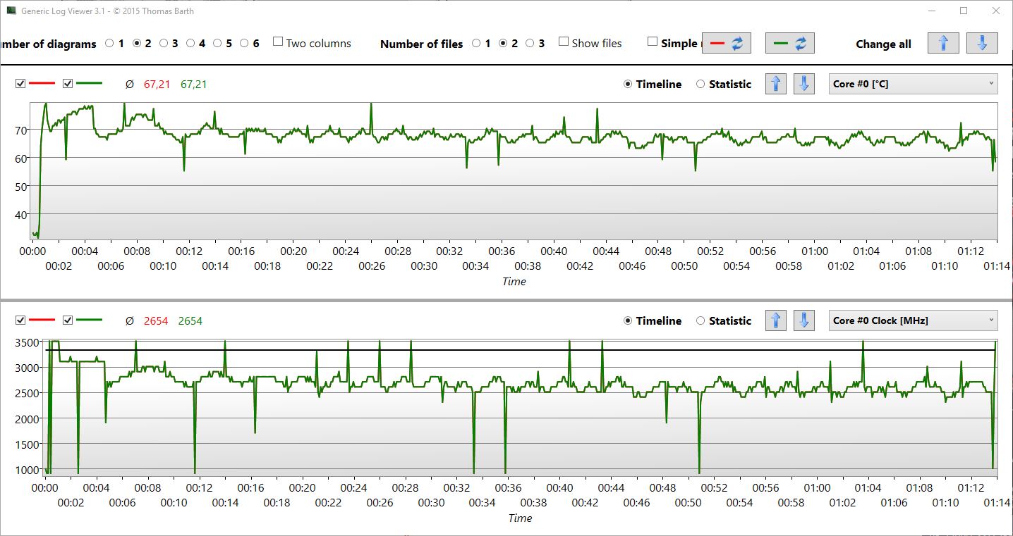 Zum Glück entpuppten die Abstürze des ersten Samples sich nicht als Serienfehler. Das Ersatzgerät direkt von Asus lief stabil, allerdings auch mit weniger Leistung bei Dauerlast. Der Turbo wird gerade mal in den ersten 20 Sekunden ausgenutzt, dann geht die Leistung schrittweise auf bis zu minus 21 % in die Knie (praxisnahe Last, Cinebench). Im praxisfernen Stresstest drosselt die CPU sogar noch um einiges mehr.