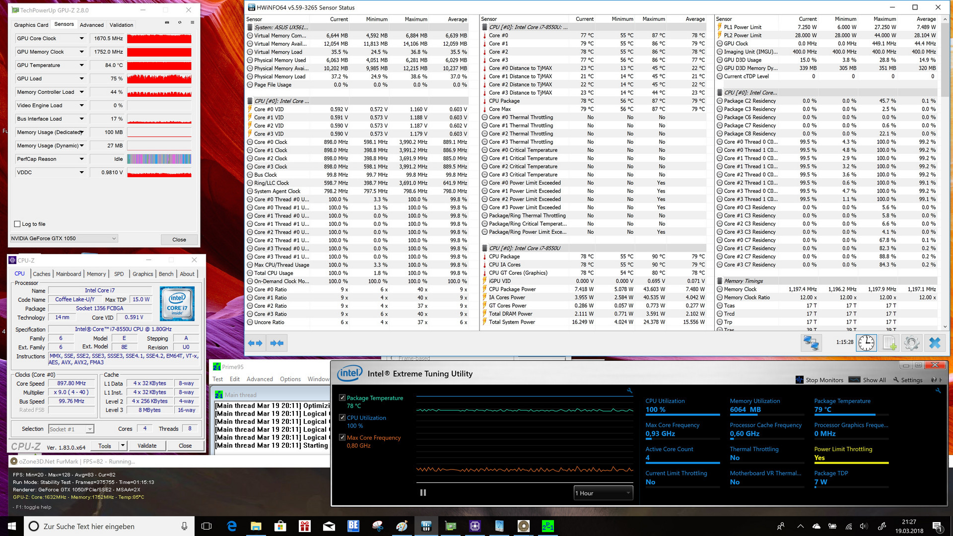 Die Gehäusetemperaturen des Asus ZenBook Flip 15 können sich sehen lassen, denn maximal messen wir 41,9 °C auf der Oberseite der Base unter Last. Die Unterseite ist mit 40,6 °C allerdings nur unwesentlich kühler. Hier im Vergleich schneidet das ZenBook Flip 15 jedoch am besten ab. Spitzenreiter bei den Gehäusetemperaturen ist hier das Acer Spin 5 mit 50,9 °C. Der Prozessor und auch die Grafikkarte haben beim Stresstest durchweg mit hohen Temperaturen zu kämpfen. Bei unserem Testgerät haben wir beim Prozessor maximal 91 °C und beim Grafikchip 84 °C notiert. Durch kurzzeitiges Thermal-Throttling musste die Taktfrequenz des Prozessors beim Furmark-Stresstest etwas abgesenkt werden. Bei gleichzeitiger Belastung von CPU und GPU fiel auf, dass der Intel Core i7-8550U auf 900 MHz Taktfrequenz gedrosselt wird, um die Hitzeentwicklung in Grenzen zu halten. Beim Grafikprozessor ist uns solch eine Drosselung bei unserem Testgerät nicht aufgefallen. Erstaunlicherweise gibt es auch nach dem Lasttest keinen Nachteil, was die 3D-Performance angeht. Der Vergleich mit 3DMark11 zeigt ein fast gleiches Ergebnis zum Kaltstart.