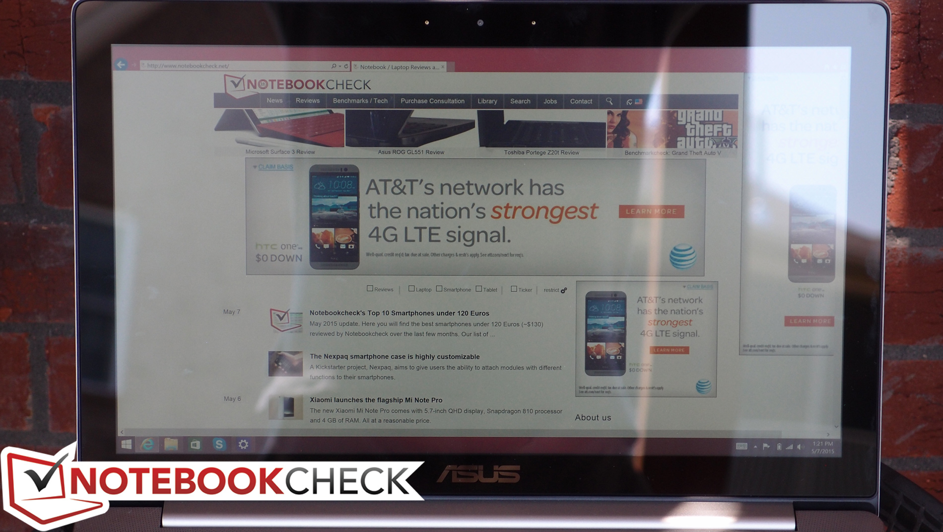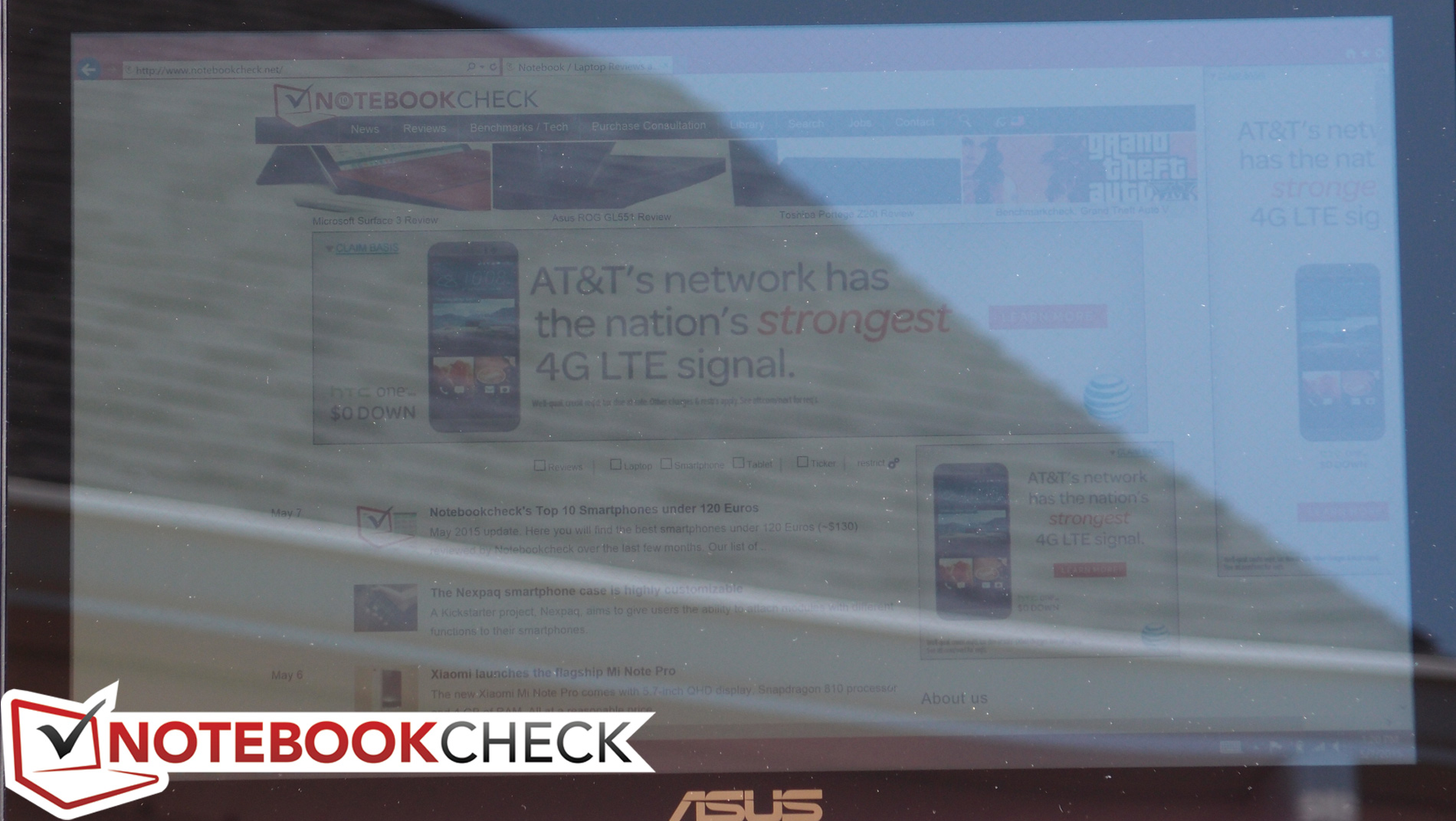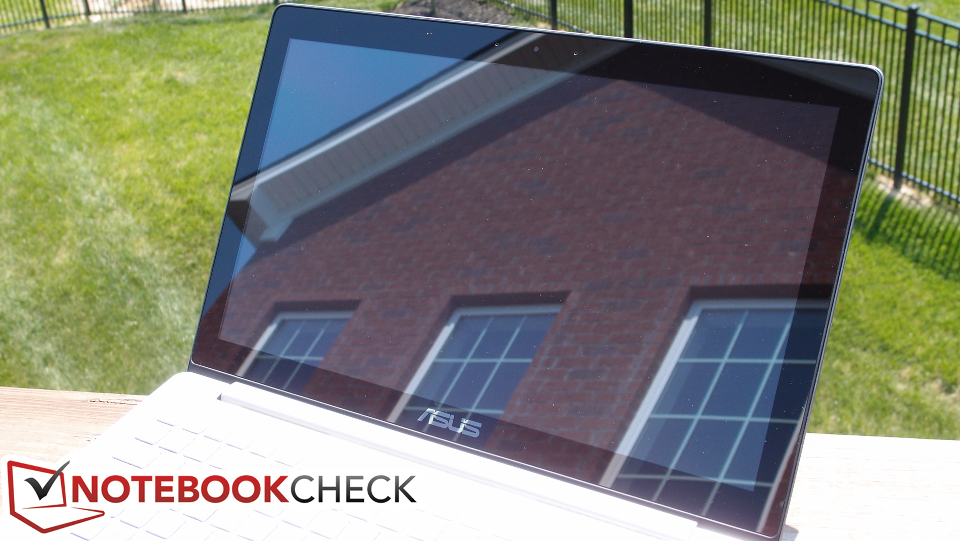 Im Freien hat das UX501 Probleme, was überwiegend an den mittelmäßigen Werten für die Helligkeit, aber hauptsächlich an dem überaus spiegelnden Bildschirm liegt. Die Nutzung des Gerätes ist leider in jeder hellen Umgebung eine Herausforderung. Beim Tippen oder der Verwendung des Touchscreens wippt der Bildschirm zudem nach, weshalb sich auch die Reflexionen bewegen und zusätzlich stören. Bei der Blickwinkelstabilität hinterlässt das IPS-Panel einen sehr guten Eindruck, wenn man die Reflexionen einmal außer Acht lässt.