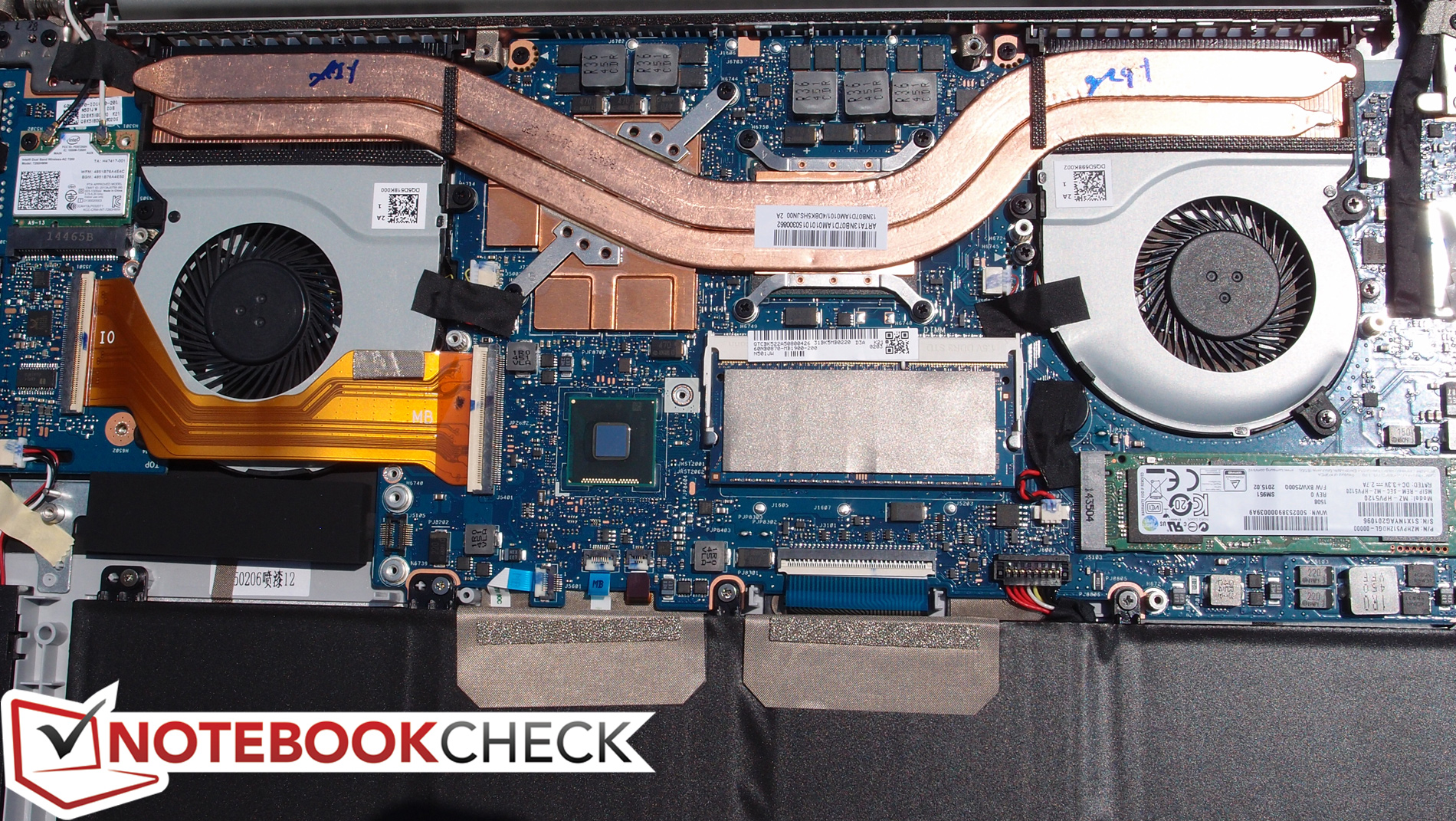 Ein Problem, wie schon beim G501, sind sicherlich die eingeschränkten Wartungsmöglichkeiten – nicht weil Upgrades nicht möglich sind (sie sind es), sondern weil die Zugänglichkeit durch die Konstruktion der Unterseite eingeschränkt ist. Um die Klappe zu entfernen und die internen Komponenten zu erreichen, müssen nicht nur 10 Torx-Schrauben gelöst werden, sondern auch noch zwei versteckte Kreuzschrauben unter den beiden vorderen Gummifüßen zu beachten. Diese sind durch doppelseitiges Klebeband fixiert, somit wird das Entfernen schwierig und unpraktisch. Falls man diese Klappe jedoch endlich mal entfernt hat, sieht man, dass fast alle wichtigen Komponenten zugänglich sind: RAM, M.2-SSD, WLAN-Modul, Lüfter und den Akku, um nur die wichtigsten Teile zu nennen.