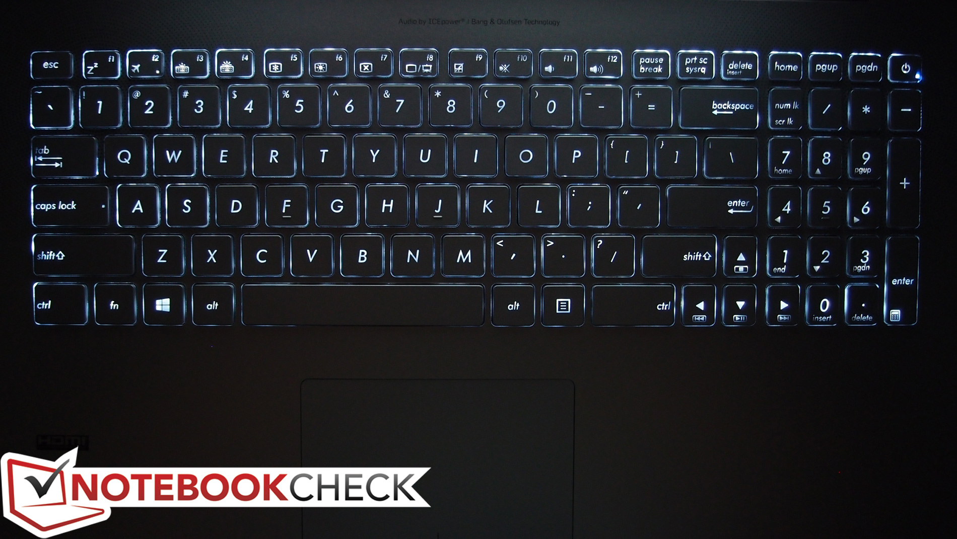 Die Chiclet-Tastatur des ZenBook Pro ist grundsätzlich komfortabel zu bedienen, allerdings haben wir zunächst einige Anschläge verpasst, bevor wir unterbewusst etwas mehr Druck ausgeübt haben als zuvor. Der Hub von 1,6 mm ist eher knapp, für den Autor aber passend. Ebenso zufrieden sind wir mit dem Feedback als auch dem Tastenabstand. Einige Tasten waren etwas lockerer und sprachen subjektiv etwas schlechter an (z. B. Backspace), aber im Großen und Ganzen ist das Schreibgefühl ansprechend. Auch die Integration eines separaten Nummernblocks gefällt uns gut. Die Tastatur verfügt über eine Hintergrundbeleuchtung, die in vier Stufen reguliert werden kann (Aus, Niedrig, Mittel und Hoch). Asus wurde in der Vergangenheit einige Male für den geringen Kontrast zwischen den Tasten und der Schrift kritisiert. Dieses Problem besteht auch beim UX501, vor allem wenn die Beleuchtung in etwas dunkleren Umgebungen aktiv ist. Es ist kein großes Problem, aber hier steht das Design offenbar über der Funktion.