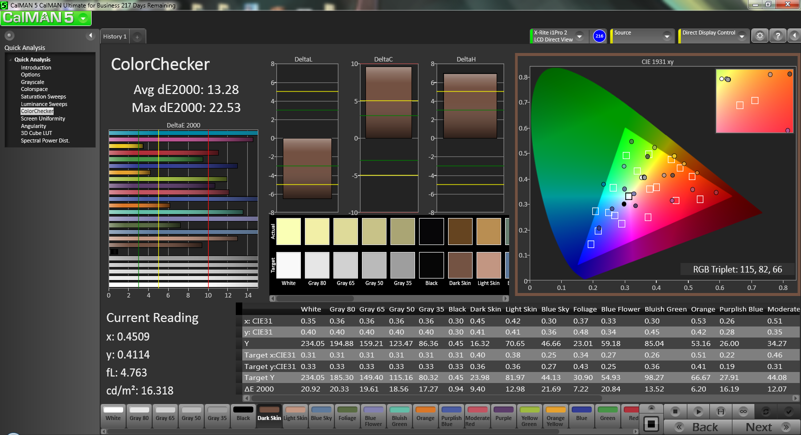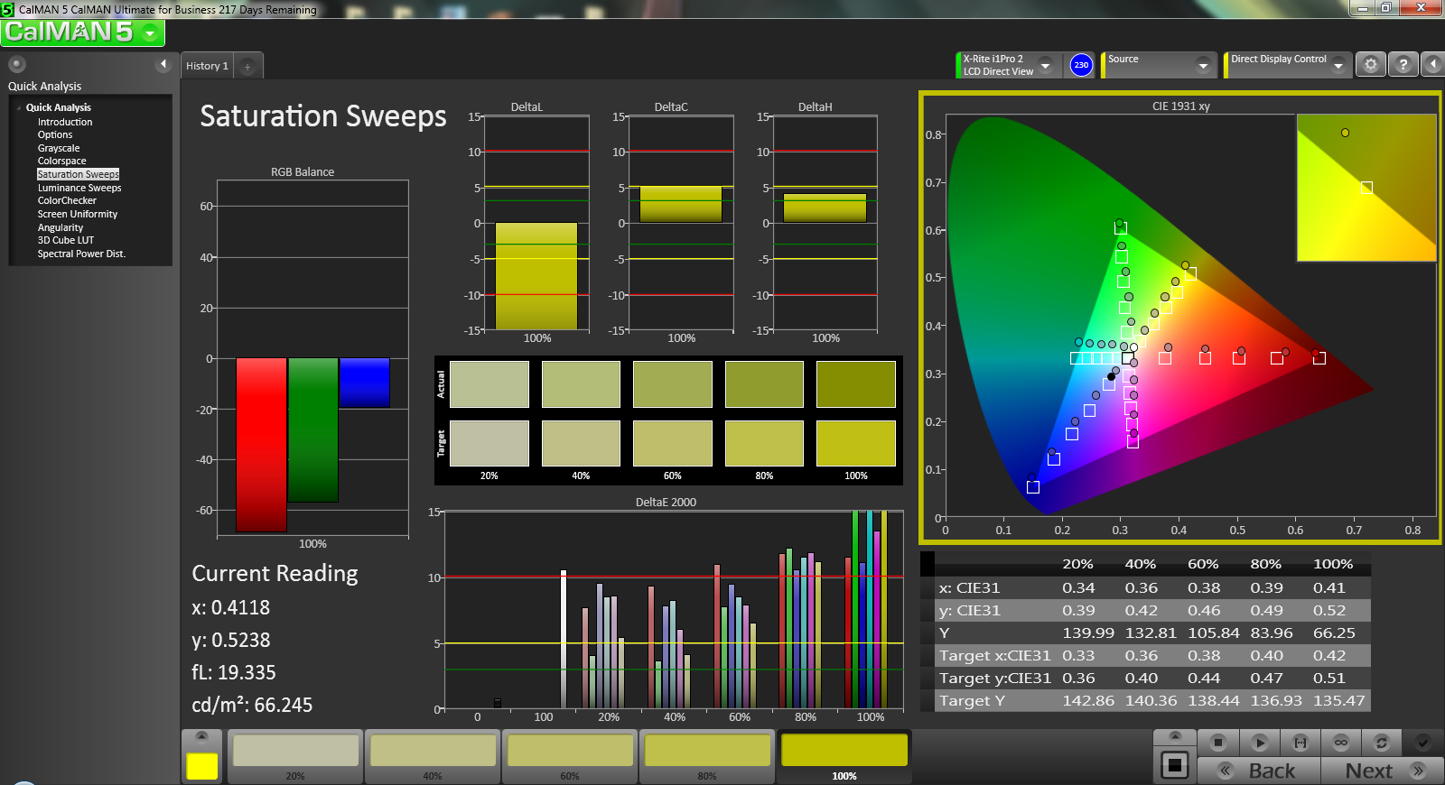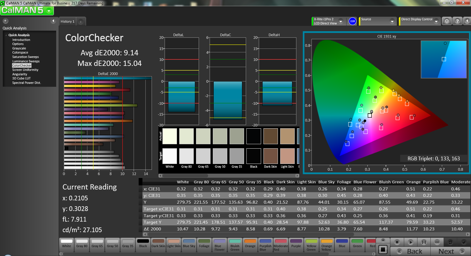 CalMAN 5 zeigt sich von der Farbgenauigkeit wenig beeindruckt. Unsere Messungen zeigen im "Normal Color Mode" eine durchschnittliche ColorChecker-Abweichung (DeltaE) von 9,14 (maximal 15,0) und eine durchschnittliche Abweichung von 7,02 für die Graustufen. Die Farbgenauigkeit im Werkszustand ist also offenbar nicht so gut wie es versprochen wurde. Im "Theater Mode" und im "Vivid Color Mode" kommt es sogar noch zu deutlich höheen Abweichungen. Mittels Kalibrieung kann man die die Situation allerdings verbessern. Wir erreichen so niedrige 1,46 bei den Graustufen und akzeptable wenngleich ausbaufähige 5,86 im Colorchecker. Andererseits ist der Gamma-Wert mit 2,24 fast perfekt und die durchschnittliche Farbtemperatur ist mit 6.006 K im Vergleich zum Idealwert (6.500) nur etwas wärmer.