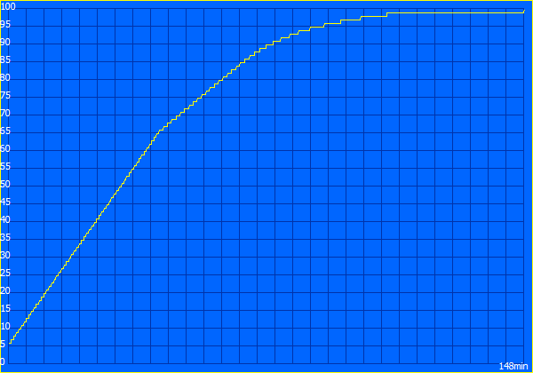 Der komplette Ladevorgang dauert bei eingeschaltetem Gerät 148 Minuten. Asus bewirbt, dass 60 % der Akkukapazität bereits nach 49 Minuten wieder zur Verfügung stehen. Auf dem Diagramm sehen wir tatsächlich, dass die Ladegeschwindigkeit bis ~65 % am höchsten ist. Die beworbenen 60 % waren bei unserem Testgerät bereits nach ~40 Minuten verfügbar; 95 % nach knapp 1,5 Stunden. Bei unserem Testgerät ist keine Software vorinstalliert, mit der man die Ladeschwellen einstellen kann.