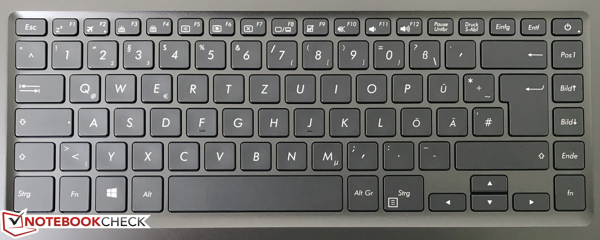 Asus implementiert eine schwarze Chiclet-Tastatur mit weißen Buchstaben. Das ergibt einen guten Kontrast, und in dunklen Umgebungen hilft eine weiße Hintergrundbeleuchtung, die drei Intensitätsstufen bietet. Trotz der recht großen Baseunit sind die Funktionstasten verkleinert, was leider auch für die Pfeiltasten gilt. Rechts befindet sich noch eine zusätzliche Spalte mit Zusatztasten (Bild auf/Bild ab usw.), weshalb man sich zunächst erst einmal an das Layout gewöhnen muss.