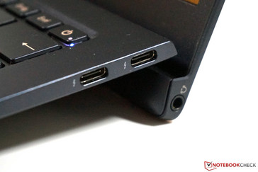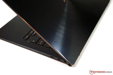Wenn ein Hersteller die Bauhöhe immer weiter reduziert, bleibt nicht mehr viel Platz für Anschlüsse übrig. Daher folgt auch das Asus ZenBook S dem aktuellen Trend, nur noch USB-C-Stecker zu verbauen. Der Anschluss auf der linken Seite entspricht den Gen.1-Standard, während die beiden Stecker auf der rechten Seite vollwertige Thunderbolt-3-Schnittstelen beherbergen. Alle drei Anschlüsse unterstützen Fast-Charge, die Videoausgabe und natürlich die Datenübertragung. Auf der rechten Seite befindet sich im hinteren Bereich zudem ein konventioneller 3,5-mm-Klinkenanschluss. Auf einen SD-Kartenleser müssen Käufer des ZenBook S aber leider verzichten.