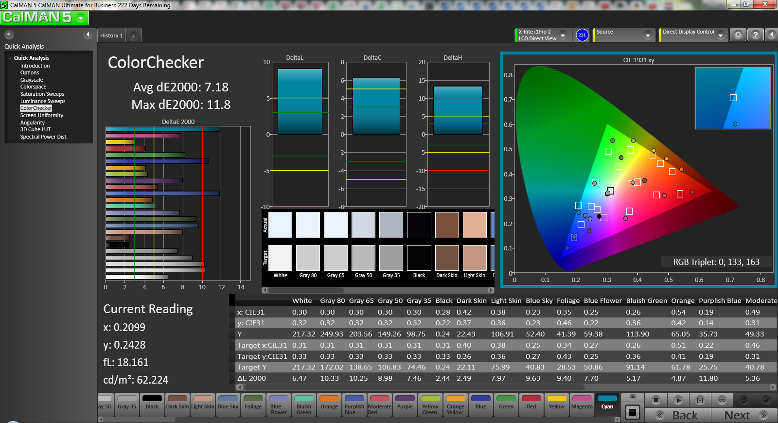 | Delta E Colorchecker * | 5.24 | 3.67 30% | 5.56 -6% | 8.03 -53% | 5.1 3% | 5.67 -8% |