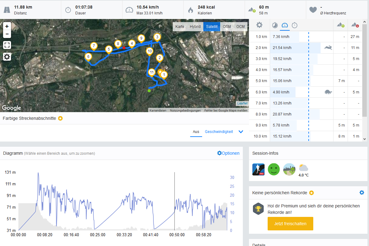 Wie immer haben wir das Testgerät auch auf eine Fahrradtour mitgenommen, die wir parallel mit dem GPS-Gerät Garmin Edge 500 aufgezeichnet haben. Dabei schlägt sich das Smartphone recht ordentlich: Die aufgezeichneten Wegstrecken beider Geräte unterscheiden sich um weniger als 2 Prozent der Gesamtlänge, sodass sich das ZenFone 3 Deluxe problemlos als Navigationsgerät eignen dürfte. Im Detail – beispielsweise bei der Brückenüberquerung kurz vor dem westlichen Wendepunkt – offenbart sich allerdings die bei Smartphones häufig anzutreffende Neigung, kleinere Abkürzungen aufzuzeichnen.