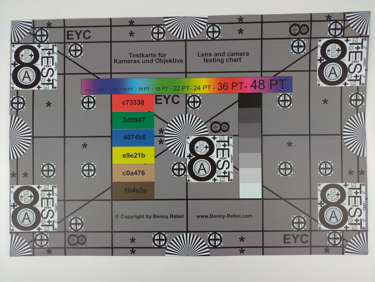 Unter kontrollierten Lichtbedingungen kann das Asus-Smartphone unseren Testchart sehr gut ablichten. Details und feine Strukturen werden scharf dargestellt und sind gut zu erkennen. In den unteren Ecken stellt sich allerdings eine deutliche Blässe ein, die auch im Weitwinkelformat erhalten bleibt.