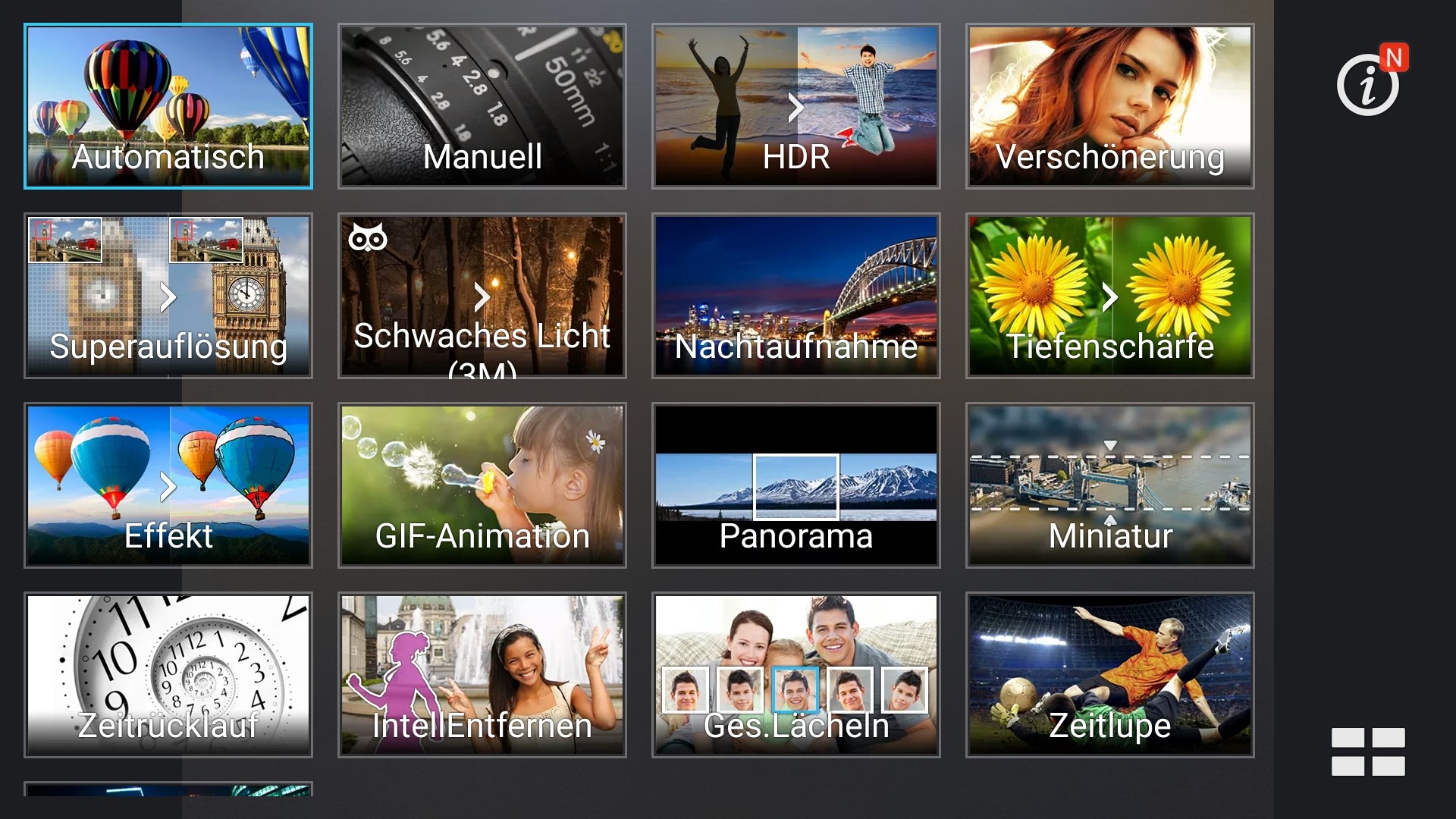 Wählen Sie eine Szene und navigieren Sie im ersten Bild. Ein Klick ändert die Position bei Touchscreens. Ein Klick auf die vergrößerten Bilder öffnet das Original in einem neuen Fenster. Das erste Bild zeigt das skalierte Foto, welches mit dem Testgerät aufgenommen wurde.