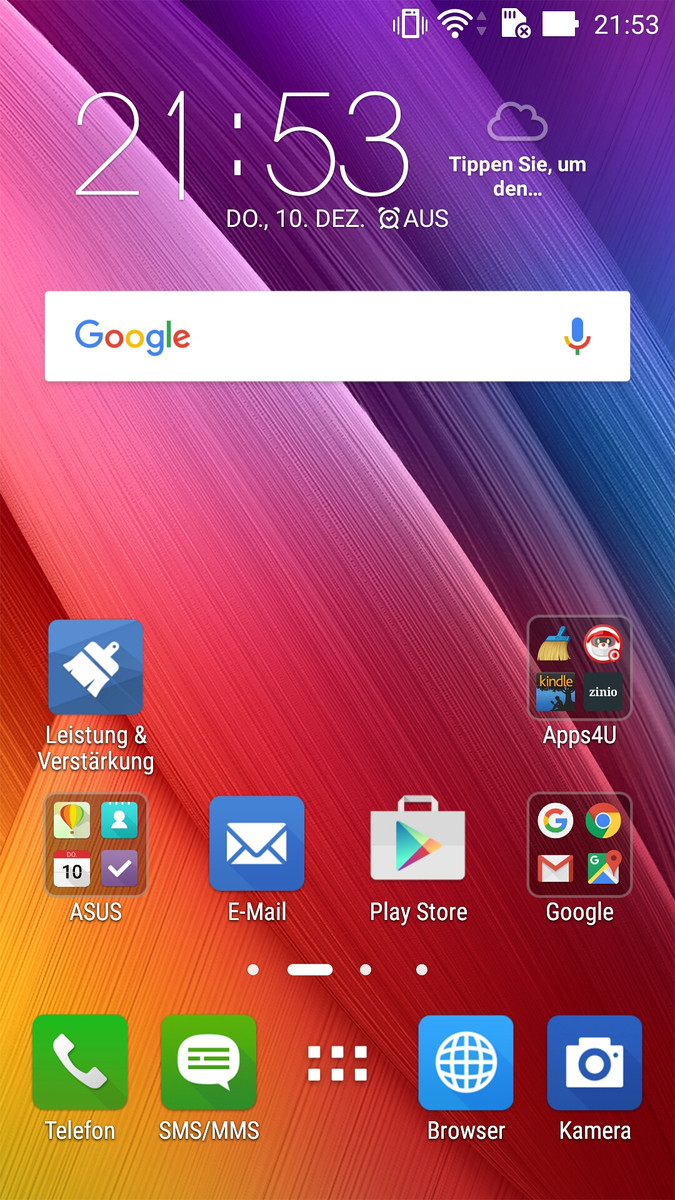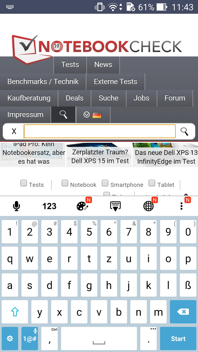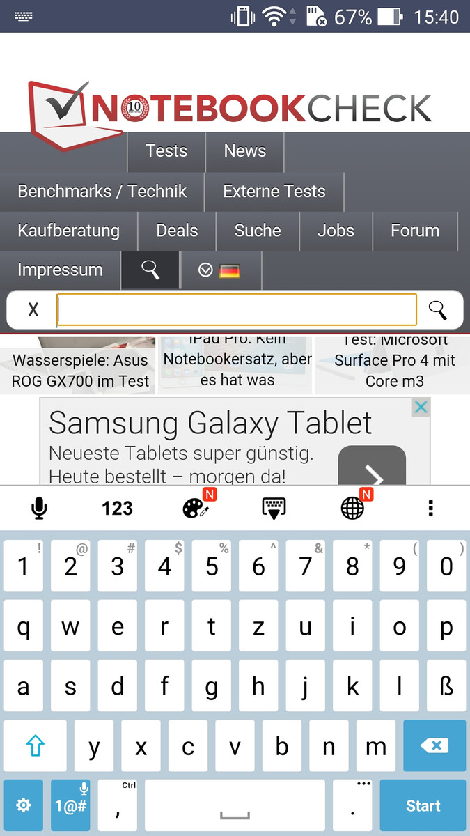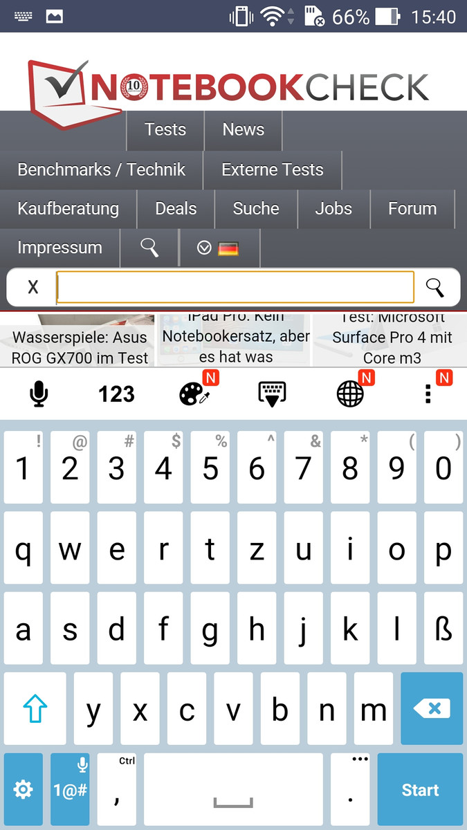 Der kapazitive Touchscreen wird von Gorilla Glass 4 geschützt und bietet ordentliche Gleiteigenschaften. Unsere Eingaben wurden auch in den Randbereichen stets präzise und verzögerungsfrei erkannt und umgesetzt. In dieser Hinsicht hinterlässt auch die ZenUI-Oberfläche einen sehr guten Eindruck, denn die Darstellung ist stets sehr flüssig und sichtbare Ruckler gibt es nicht. Die virtuelle Tastatur von Asus lässt sich gut bedienen und bietet alle üblichen Funktionen wie Wisch-Eingaben oder Wortvorschläge. Zudem lässt sich die Höhe der Eingabe in einem gewissen Bereich einstellen, allerdings bleibt dann je nach Einstellung nicht mehr viel vom eigentlichen Bildschirminhalt übrig. Die Android-Tasten wurden als Sensortasten unterhalb des Bildschirms integriert, sind aber leider nicht beleuchtet. Das Smartphone bietet auch einen Handschuh-Modus. Wir haben es mit Stoffhandschuhen ausprobiert und die Bedienung klappte tatsächlich ziemlich gut. Selbst Eingaben auf der Tastatur waren möglich.