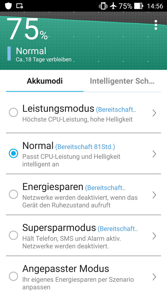 Die Software bietet umfangreiche Optionen, um Strom zu sparen und auch die Leistung zu beeinflussen. Dabei kann man sich zwischen verschiedenen Profilen entscheiden (Leistungsmodus, Normal, Energiesparen, Supersparmodus, Angepasster Modus). Im angepassten Modus kann man sogar einzelne Apps aktivieren oder deaktivieren. Diese Modi lassen sich zu jeder Zeit verwenden, zudem können sie bei bestimmten Restkapazitäten (in 5-%-Schritten bei weniger als 30 % Restkapazität) oder auch zu bestimmten Uhrzeiten aktiviert werden. Mit dem beiliegenden 10-Watt-Netzteil dauert es rund 2,5 Stunden, bis der Akku wieder vollständig geladen ist.