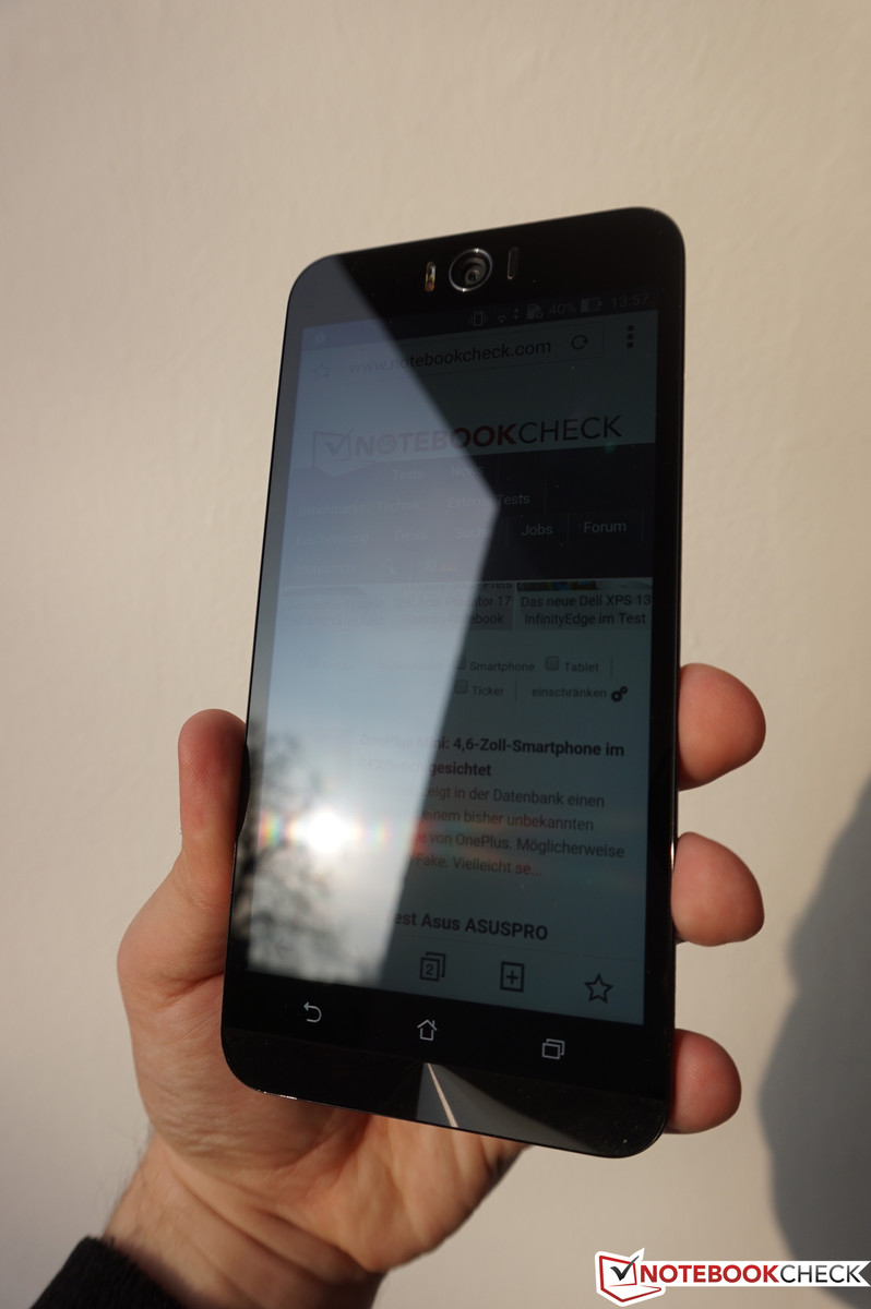 Asus stattet das ZenFone Selfie mit einem 5,5 Zoll großen Full-HD-IPS-Display aus. Die Auflösung liegt bei 1.920 x 1.080 Pixeln und führt zu einer Pixeldichte von 400 PPI. Bilder und Schriften sind damit sehr scharf und subjektiv hinterlässt das Bild einen guten Eindruck. Die durchschnittliche Helligkeit liegt mit 382 cd/m² auf einem vergleichsweise geringen Niveau für ein LC-Display. Hier schneiden die Vergleichsgeräte mit der Ausnahme des AMOLED-basierten Galaxy A7 besser ab. Auch der Schwarzwert ist mit 0,41 cd/m² der höchste im Vergleich, was folgerichtig auch in dem geringsten Kontrastverhältnis resultiert. Beinahe 1.000:1 sind für sich gesehen keinesfalls schlecht, aber die Konkurrenten bieten mehr. Die Ausleuchtung liegt bei sehr guten 93 %.