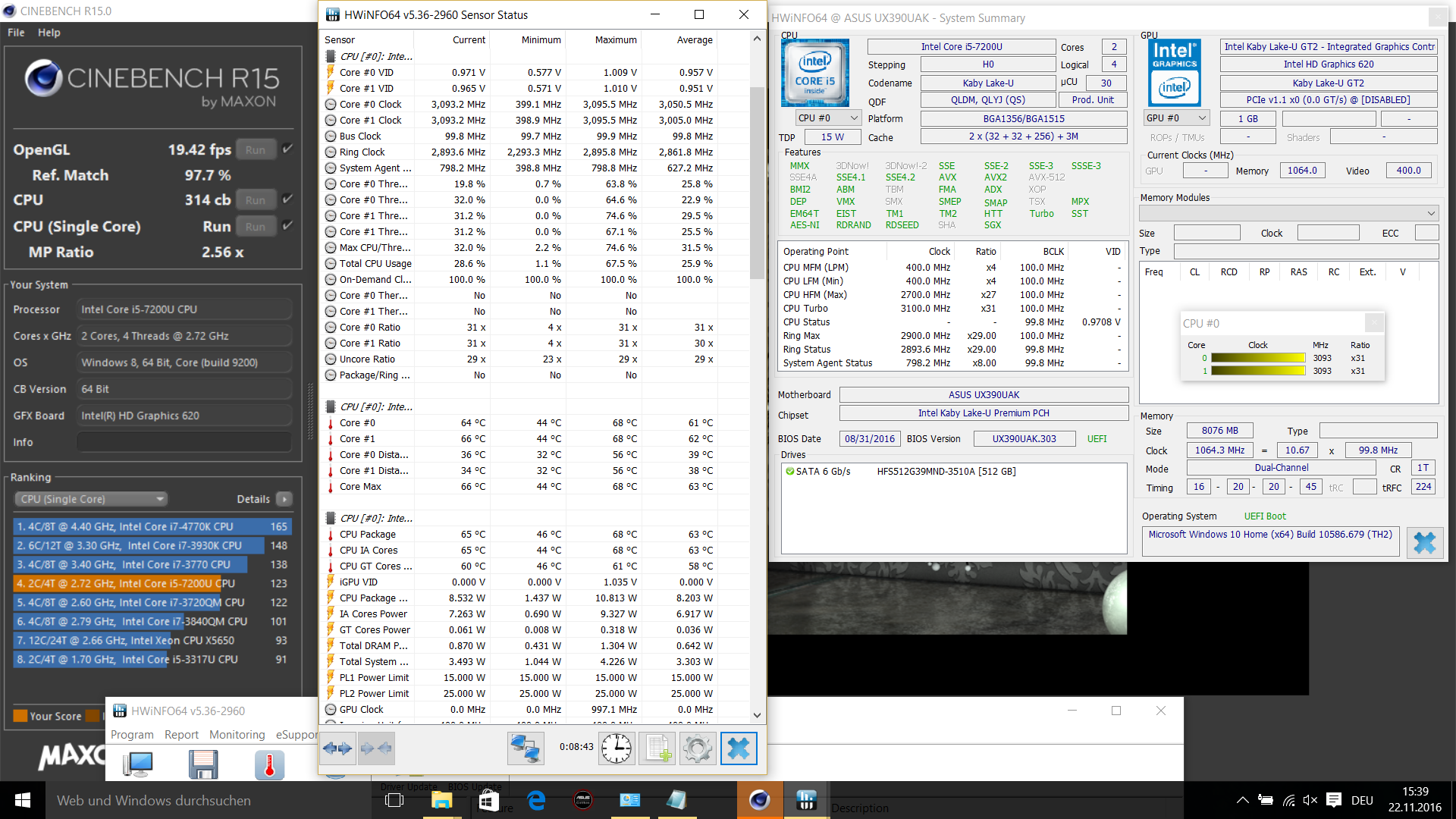 Im Cinebench-Test offenbarte das Zenbook eine gute Turbo-Festigkeit, 2,8 GHz wurden auch in der R15-Schleife niemals unterschritten. Wie geht es im Stresstest weiter, wenn zusätzlich auch noch die iGPU rechnen muss?