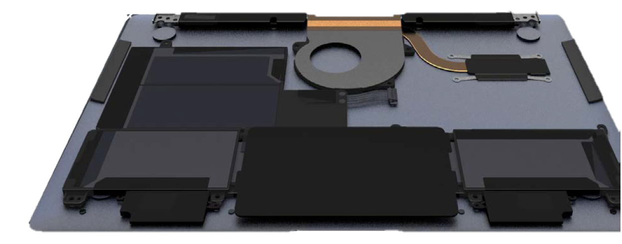 Der Arbeitsspeicher befindet sich unter der silbernen Kühl-Platte direkt unter dem SoC. Die einzigen auswechselbaren Komponenten sind also die M.2 SSD (unter dem Kühl-Pad), der Lüfter und der Akku. Das WLAN-Modul ist ebenso austauschbar, müsste aber über den Hersteller bezogen werden, denn es ist kein Standard M.2-Sockel.