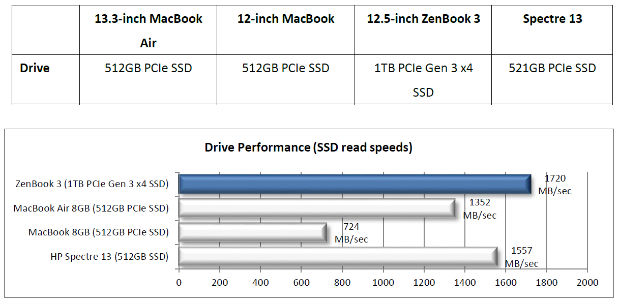 | Asus Zenbook 3 UX390UA-GS041T i5-7200U, HD Graphics 620, SK Hynix Canvas SC300 512GB M.2 (HFS512G39MND), IPS, 1920x1080, 12.5" | Apple MacBook 12 (Early 2016) 1.1 GHz 6Y30, HD Graphics 515, Apple SSD AP0256, IPS, 2304x1440, 12" | Dell XPS 13 9360 QHD+ i7 i7-7500U, HD Graphics 620, Toshiba NVMe THNSN5256GPUK, IPS, 3200x1800, 13.3" | HP EliteBook Folio G1 V1C37EA 6Y54, HD Graphics 515, Samsung SM951 MZVPV256 m.2, IPS, 1920x1080, 12.5" | Razer Blade Stealth QHD i7-7500U i7-7500U, HD Graphics 620, Samsung PM951 NVMe MZVLV256, , 2560x1440, 12.5" | Acer Aspire S 13 S5-371-71QZ 6500U, HD Graphics 520, LiteOn CV1-8B512, IPS, 1920x1080, 13.3" | HP Spectre 13 6500U, HD Graphics 520, Samsung PM951 NVMe MZVLV256, IPS UWVA, 1920x1080, 13.3" | |