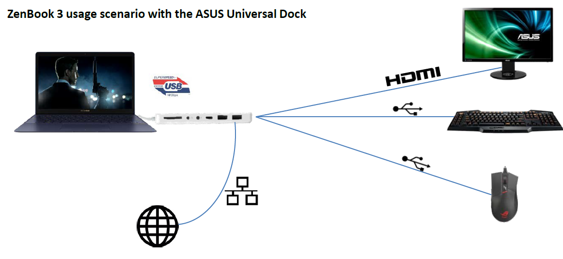 Der Hersteller preist den Audio Pod mit 5.1 Sound als ideales Zubehör für Musik-Liebhaber und Cineasten an. Er verbindet sich mit Bluetooth und soll für Surround-Sound sorgen. Das Universal-Dock ist die große Schwester des mitgelieferten Mini-Docks für den Type-C-USB. Es bringt USB-C 3.1, USB 3.0, HDMI, VGA, LAN-Anschluss und 3-in-1 Kartenleser an das flache Zenbook. Beide Zubehör-Teile sind in Deutschland noch nicht verfügbar, wir können keine Preise nennen.