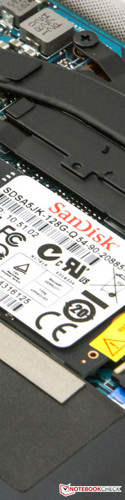 Als Speichermedium setzt Asus in unserem Testgerät ein Solid State Drive (SSD) von SanDisk mit einer Bruttokapazität von 128 GByte ein. Das Modell vom Typ U100 befindet sich auf einer schmalen Platine mit proprietärem Anschluss. Das SSD wird über SATA III mit maximal 6 Gbit/s angesteuert. CrystalDiskMark attestiert gute Übertragungswerte von 440 MB/s (Read) bzw. 270 MB/s (Write), bei leichten Schwächen bei kleinen Datenblöcken (4k - 14/10 MB/s). Die Zugriffszeiten liegen im Rahmen für ein Flash-Laufwerk (AS SSD). Es gibt durchaus verschiedene mSATA-SSDs, die deutlich besser abschneiden. Darunter beispielsweise die Lite-On LMT-256M3M des Samsung 900X3C-A04DE.