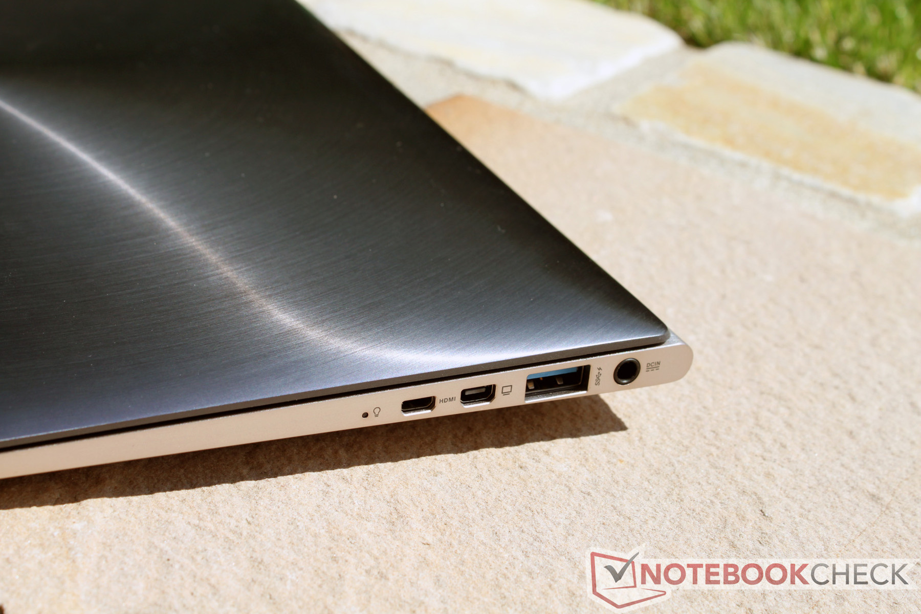Da das Unibody-Gehäuse im Gegensatz zum Zenbook UX32VD etwas schlanker ausfällt, muss man bei den angebotenen Schnittstellen in diesem Vergleich ein paar Einsparungen hinnehmen. Linker Hand im hinteren Bereich finden wir einen USB 3.0 Port, den kombinierten Kopfhörer bzw. Mikrofonanschluss sowie einen SD-Cardreader. An der rechten Seite wird das Angebot abgerundet durch einen Mikro-HDMI Port, einen Mini-VGA Port, eine weitere USB 3.0 Buchse sowie den Stromanschluss.