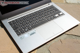 Optik als auch Haptik lassen im UX31A die selbe Tastatur und Touchpadeinheit wie im Zenbook UX32VD vermuten. Das Tippgefühl unterscheidet sich dann dennoch vom bereits getesteten UX32VD, das vor allem unter einem auffälligem Federn der Tastatur litt. Dies ist nun Geschichte, dem Unibody-Gehäuse sei Dank, und am Tastenfeedback gibt es nunmehr auch nur noch Kleinigkeiten anzumerken. Wir würden das Tippgefühl vor allem als sehr "kurzhubig" beschreiben, das je nach individuellen Gewohnheiten eine gewisse Einarbeitungsphase verlangt.