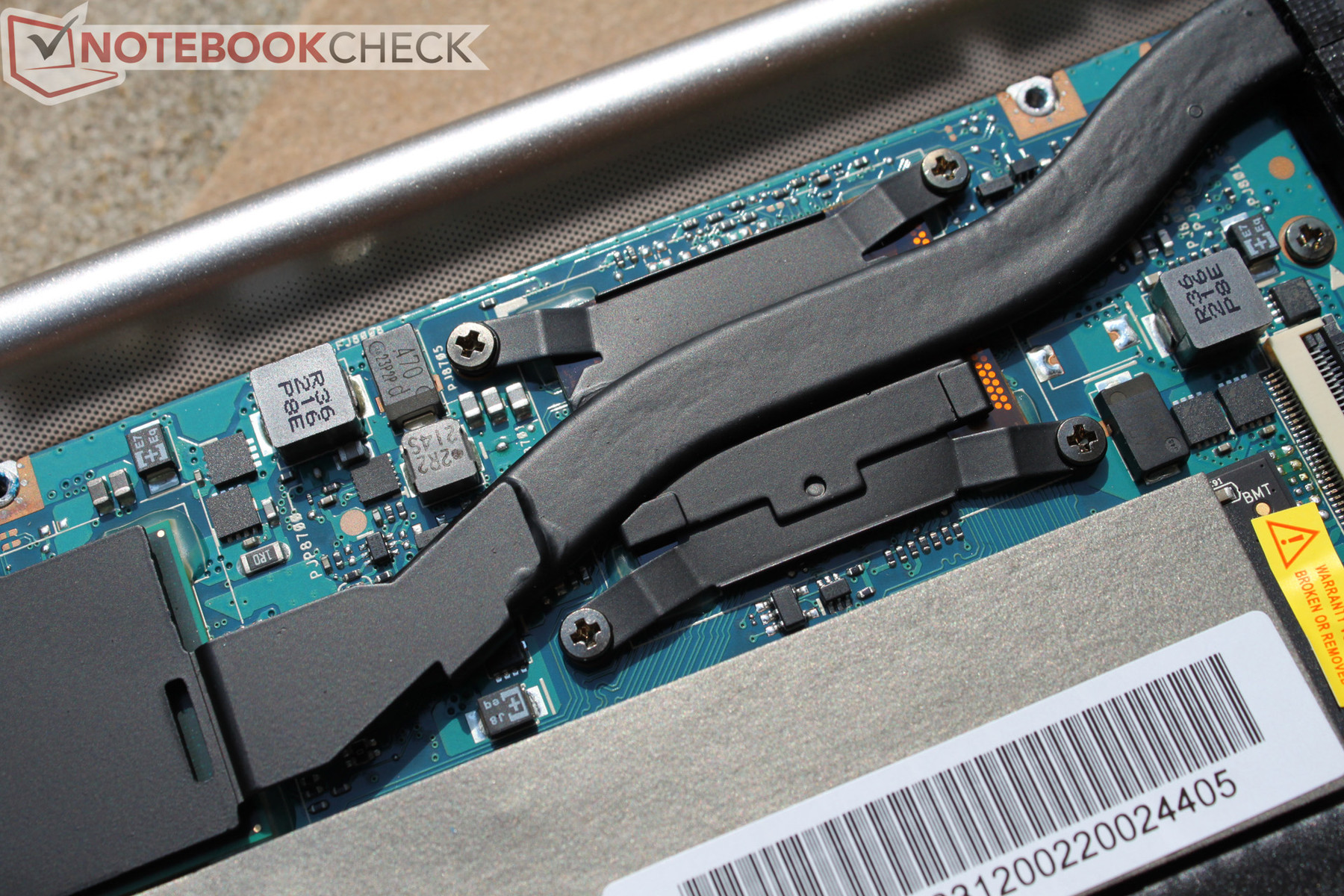 Während viele Hersteller eher den Weg der dünnen Ultrabooks einschlagen und immer mehr abgekapselte und für den User nicht zugängliche Gehäuse anbieten, verpasst Asus dem UX31A, wie schon dem Vorgänger, eine große Wartungsklappe, die allerdings nicht ganz üblichen kleinen Torqx-Schrauben gesichert ist. Ausgestattet mit dem richtigen Werkzeug darf man dann aber doch einen Blick in das Innere des Zenbooks wagen. Dort haben wir wie schon beim UX32VD-Zugang zu nahezu allen Komponenten: Akku, WLAN, SSD, Lüfter und Kühler. Diverse Wartungsarbeiten sind für den geübten User hier problemlos möglich. RAM-Upgrades sind nicht möglich, da die Chips angesichts der kompakten Bauform direkt auf das Mainboard gelötet worden sind.