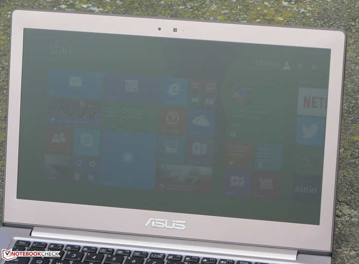 Das Zenbook ist nur mit einem blickwinkelinstabilen TN-Panel ausgestattet. Somit kann der Bildschirm nicht aus jeder Position heraus abgelesen werden. In horizontaler Richtung ist der Winkel recht großzügig bemessen. Auch mehrere Personen können gleichzeitig auf das Display schauen. Eine Änderung des vertikalen Blickwinkels führt schnell zum Einbruch des Bildes. Eine Nutzung im Freien ist allenfalls in schattigen Umgebungen möglich.