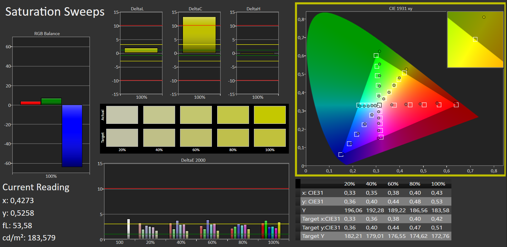 | Delta E Graustufen * | 2.36 | 3.79 -61% | 6.7 -184% | 5.16 -119% | 3.51 -49% | 8.02 -240% | 3.18 -35% |