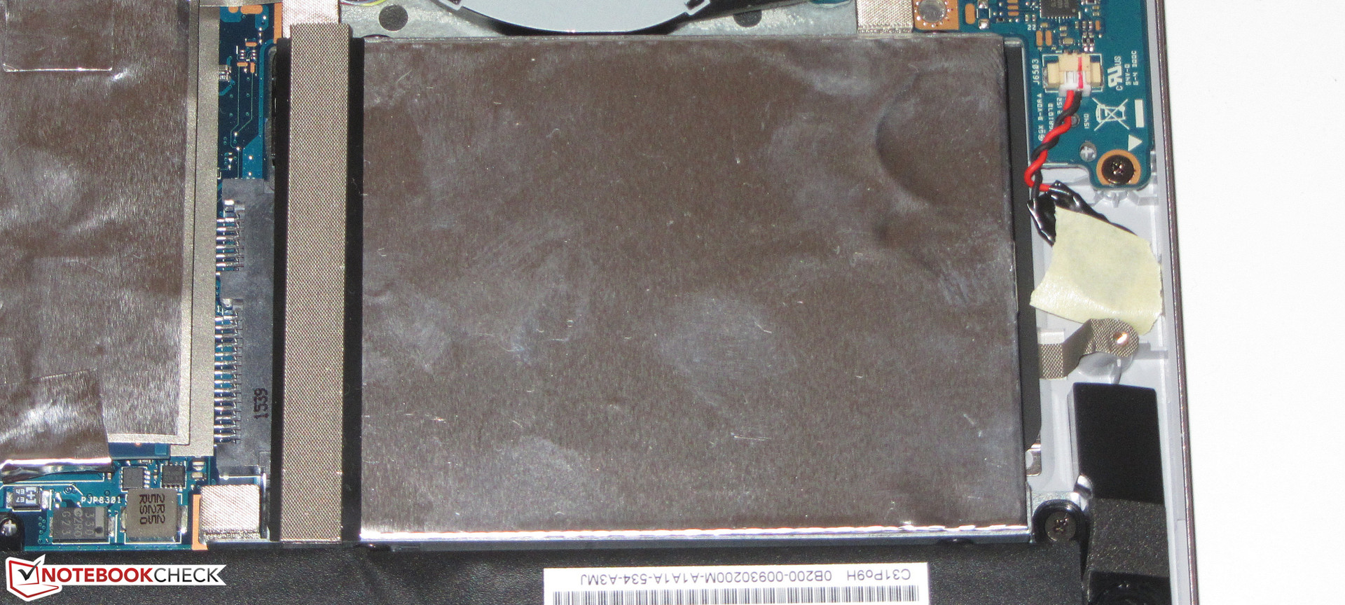 Das Zenbook ist mit einer Solid State Disk von Micron bestückt. Es handelt sich um ein Modell im 2,5-Zoll-Format. Die SSD bietet eine Gesamtkapazität von 512 GB. Sie ist ab Werk in eine Betriebssystempartition (190 GB) und eine Datenpartition (286 GB) unterteilt. Der restliche Speicherplatz wird von der Recovery Partition belegt. Die SSD wartet mit guten Transferraten auf. Frühere Modelle des Zenbook bringen neben einem Anschluss für eine 2,5-Zoll-Festplatte auch noch einen mSATA- bzw. M.2-Steckplatz mit. Unser aktuelles Testgerät verfügt nicht über einen solchen Steckplatz.