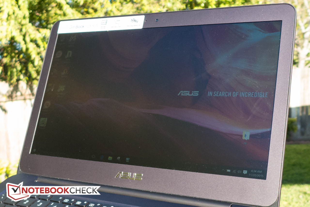 Dank einer ziemlich hohen Helligkeit, sehr gutem Kontrast und einer überdurchschnittlich guten Anti-Reflex-Beschichtung kann das UX305CA ohne große Einschränkungen im Freien genutzt werden. Direktes Sonnenlicht sollte vermieden werden, doch das Arbeiten im Schatten oder an bedeckten Tagen ist sicherlich ohne Einschränkungen möglich. Das Foto rechts zeigt den Bildschirm, wenn er Sonnenlicht ausgesetzt ist. Allerdings haben wir durch leichtes Drehen des Gerätes Blendungen vermeiden können.