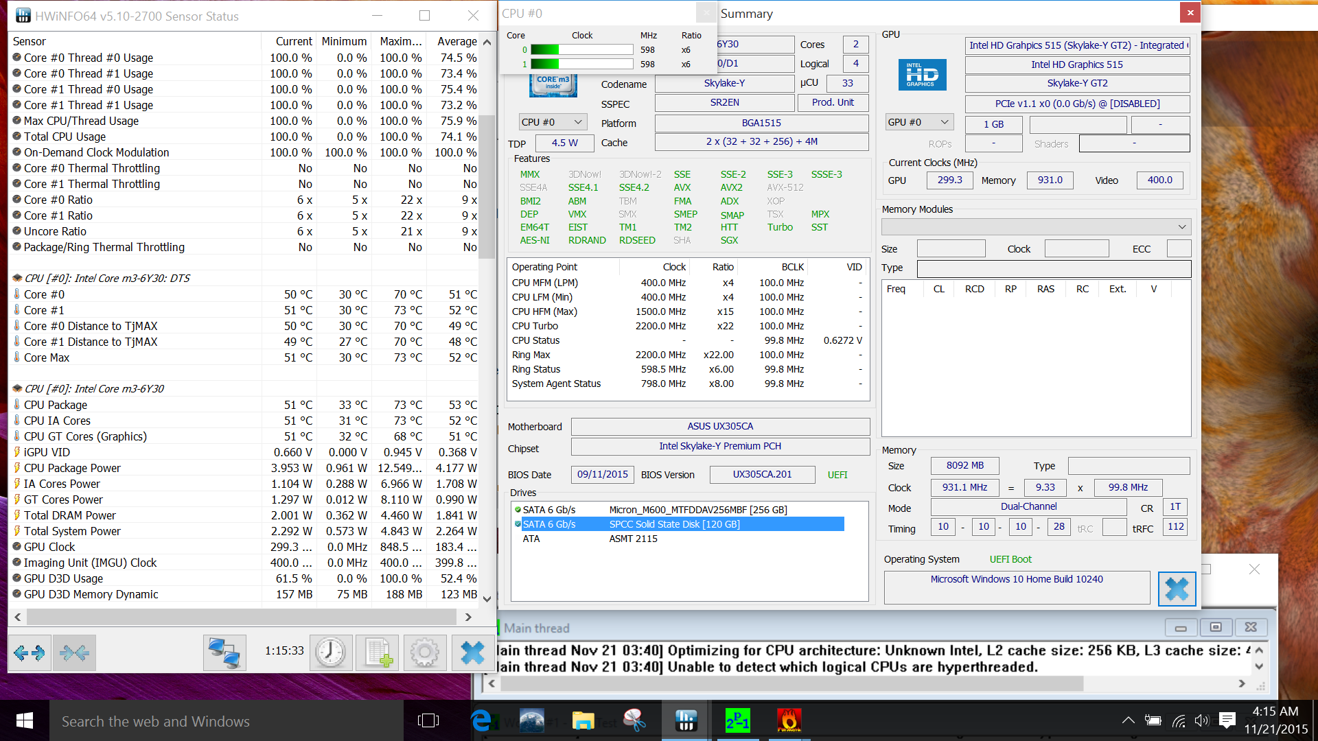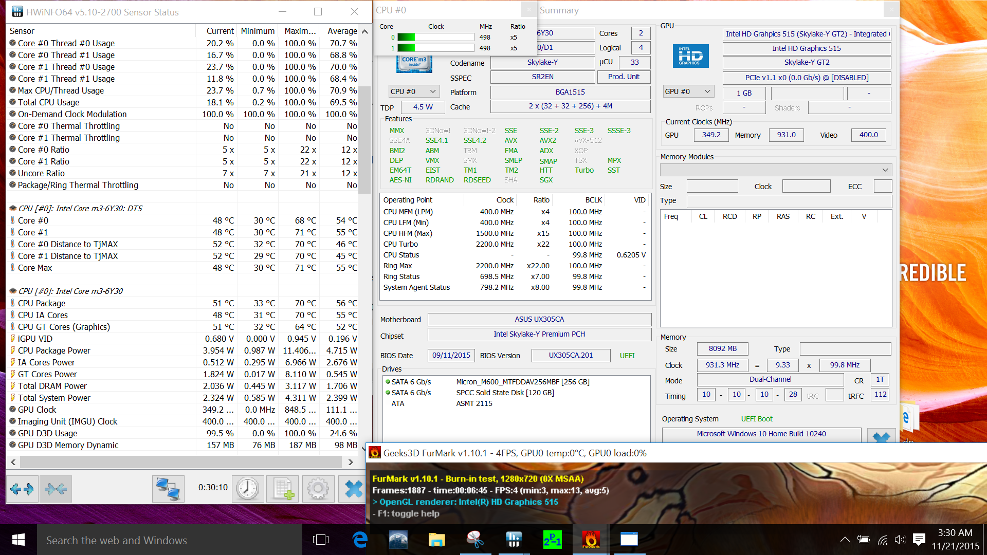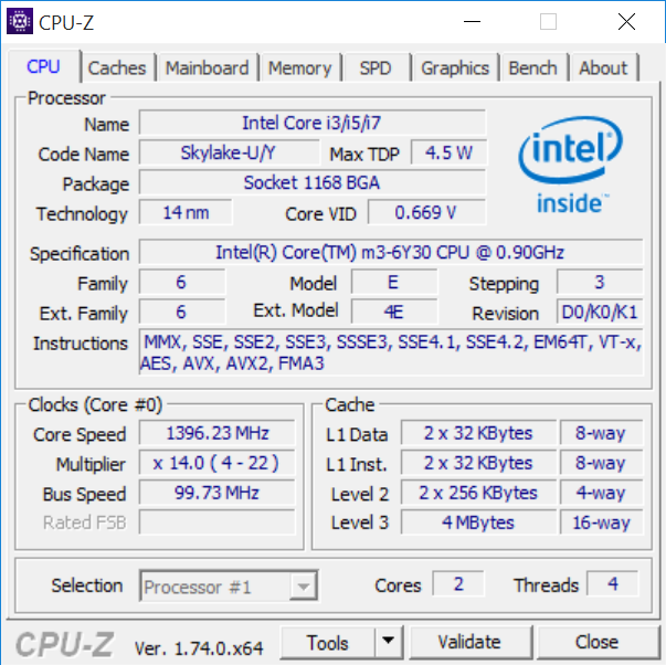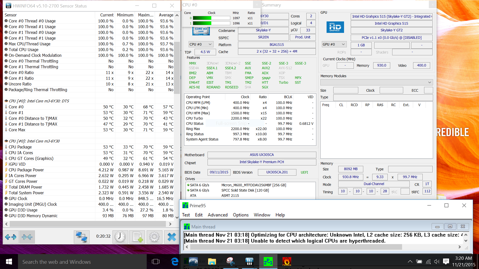 Der Skylake Core m3-6Y30 ist ein extrem genügsamer Dual-Core-SoC mit einer Taktrate von 900 MHz, der dank Turbo auf 2 GHz (beide Kerne) bzw. 2,2 GHz (ein Kern) übertakten kann. Der m3-6Y30 hat eine TDP von nur 4,5 Watt und ist damit ideal für lüfterlose Notebooks. Auf dem Papier ist die Leistung des m3 Chips gleichauf mit der vorigen Generation der i3-CPUs (z.b. dem Core i3-5010), die eine viel höhere TDP von 15 Watt aufweist. In einem passiv gekühlten Gerät hängt die tatsächliche Leistung von der Implementation ab - und es stellt sich heraus, dass das UX305CA nicht halten kann, was der m3-6Y30 verspricht: Sogar sehr kurze Last-Zyklen führten - manchmal sehr merklich - zur einer Verringerung der CPU-Leistung. Während unseres X264 Video-Codierungs-Benchmarkstest beispielsweise fiel die Framerate während der vierten Iteration deutlich (Pass 1, #1: 76,5 fps; pass 1, #4: 67,2 fps). Die gleiche CPU schafft im Microsoft Surface Pro 4 eine viel bessere Leistung: Während wir 1,79 Punkte (multi) und 0,81 Punkte (single) im Cinebench R11.5 Benchmark-Test aufzeichneten, schnitt das Surface Pro 4 ungefähr 25 % besser (2,27 / 0,98 Punkte) ab.