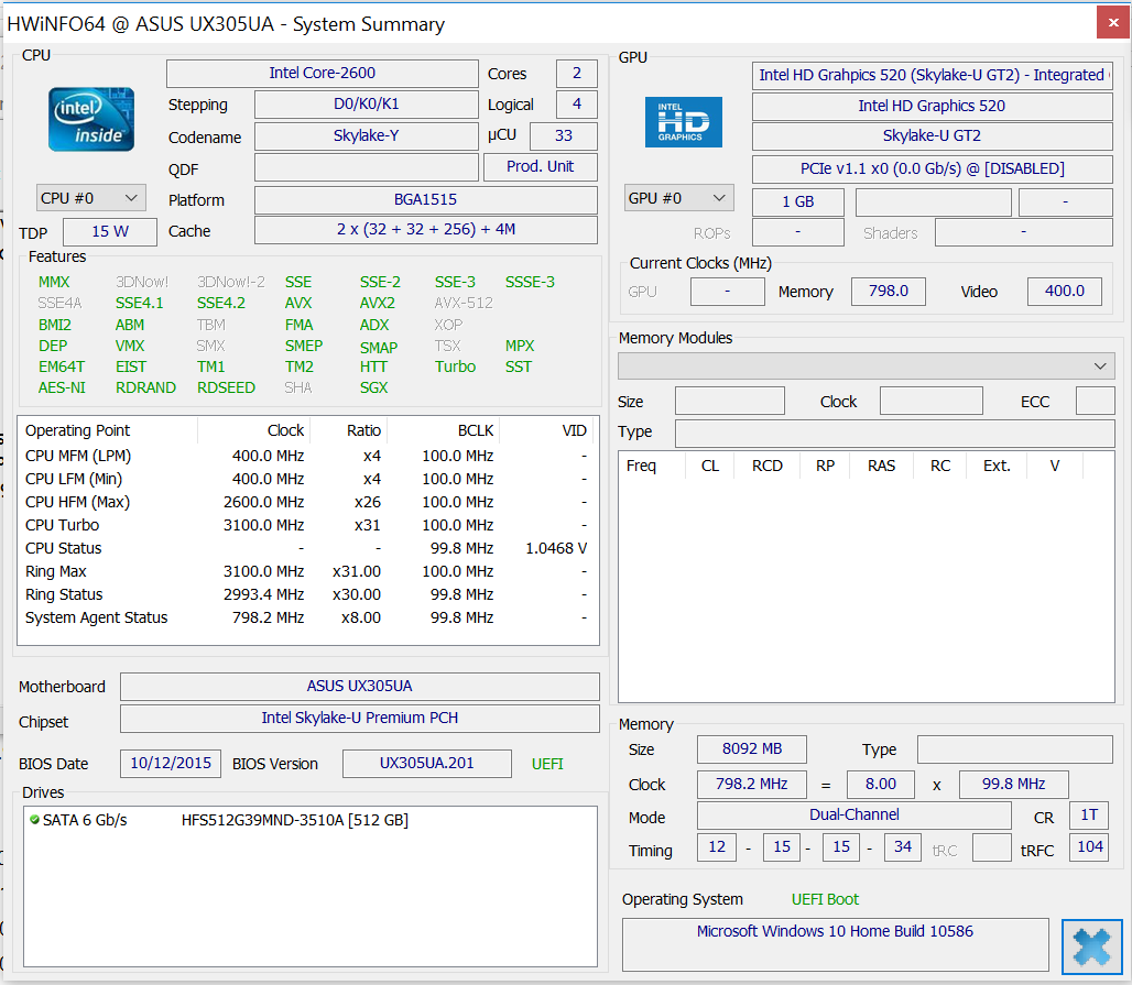 Im Inneren des Zenbook steckt ein Intel Core i7-6500U (Skylake) Zweikernprozessor. Hierbei handelt es sich um einen Vertreter der oberen Mittelklasse, der den Ansprüchen der meisten Nutzer genügen sollten. Seine TDP beträgt 15 Watt. Die CPU arbeitet mit einer Basisgeschwindigkeit von 2,5 GHz. Mittels Turbo kann die Geschwindigkeit auf 3 GHz (zwei Kerne) bzw. 3,1 GHz (ein Kern) beschleunigt werden. Der Turbo wird im Netz- und im Akkubetrieb eingesetzt.