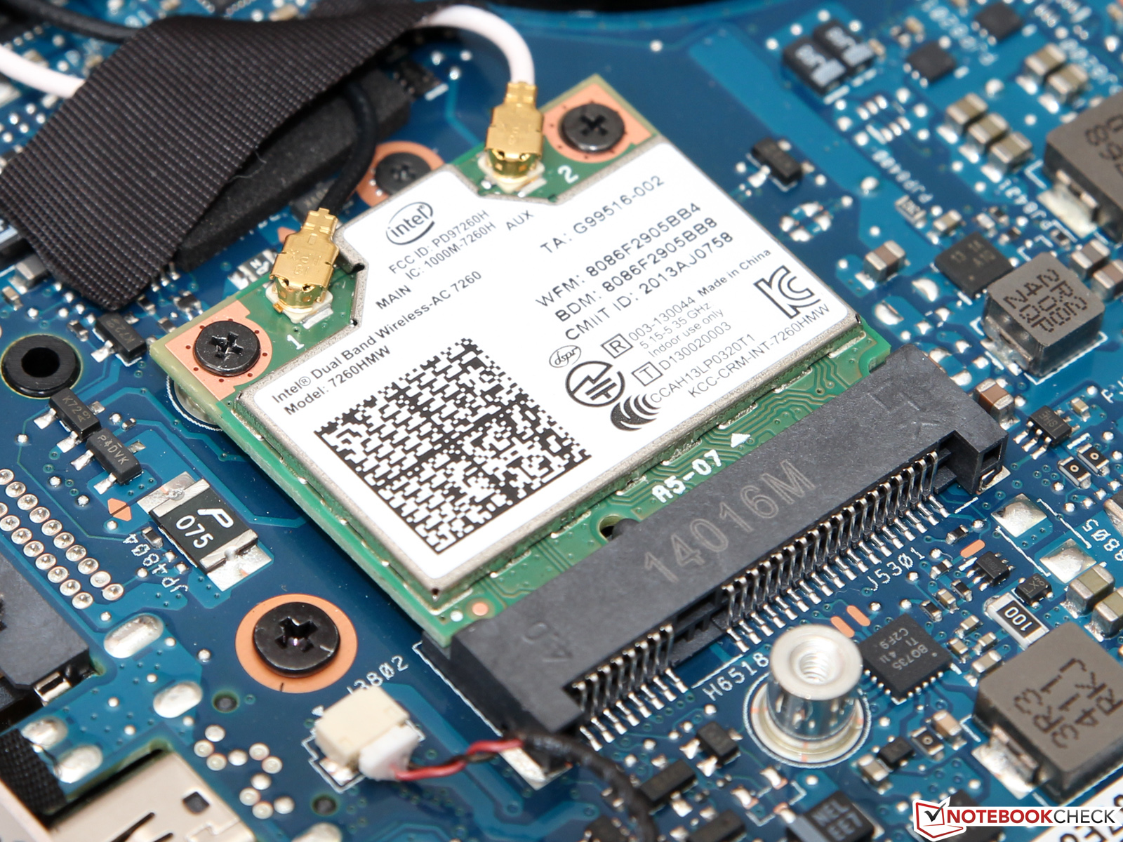 Mangels LAN-Adapter lässt sich das Zenbook ausschließlich drahtlos ins heimische Netzwerk einbinden. Das von Intel stammende WLAN-Modul Wireless-AC 7260 beherrscht dabei nicht nur alle wichtigen Funkstandards (802.11a/b/g/n/ac, Bluetooth 4.0), sondern ist auch Dual-Band- (2,4/5 GHz) sowie Dual-Stream-fähig (2x2 TX/RX). In Verbindung mit einem 802.11ac-Router vom Typ TP-Link Archer C7 konnten wir auf kurze Entfernung eine hervorragende Nettoübertragungsrate von rund 17 MB/s ermitteln, die bei schwierigeren Empfangsbedingungen (4 Meter Strecke, eine Ziegelwand) auf knapp 14 MB/s absank. Ein Test im 802.11n-Modus zeigte in beiden Fällen nur etwa 7,5 MB/s.