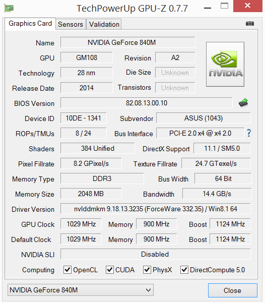 Die technischen Details und Performance-Einschätzungen zur Intel HD Graphics 4400 wollen wir an dieser Stelle überspringen und hierfür auf unsere GPU-Datenbank verweisen. Sehr viel mehr Spannung verspricht ohnehin der Blick auf die zusätzliche GeForce 840M: Als Ableger der neuen Maxwell-Architektur ist dieses Modell erst seit wenigen Monaten auf dem Markt und hat so einige Besonderheiten zu bieten. Neben der Leistungsaufnahme konnte Nvidia auch den Bandbreitenbedarf gegenüber dem Vorgänger stark reduzieren, sodass die Karte mit einem nur 64 Bit breiten Speicherinterface (2 GB DDR3, 900 MHz) auskommt. Darüber hinaus arbeiten die 384 Shadereinheiten (1.029 - 1.124 MHz) nun deutlich effizienter als die gleiche Anzahl Kepler-ALUs.