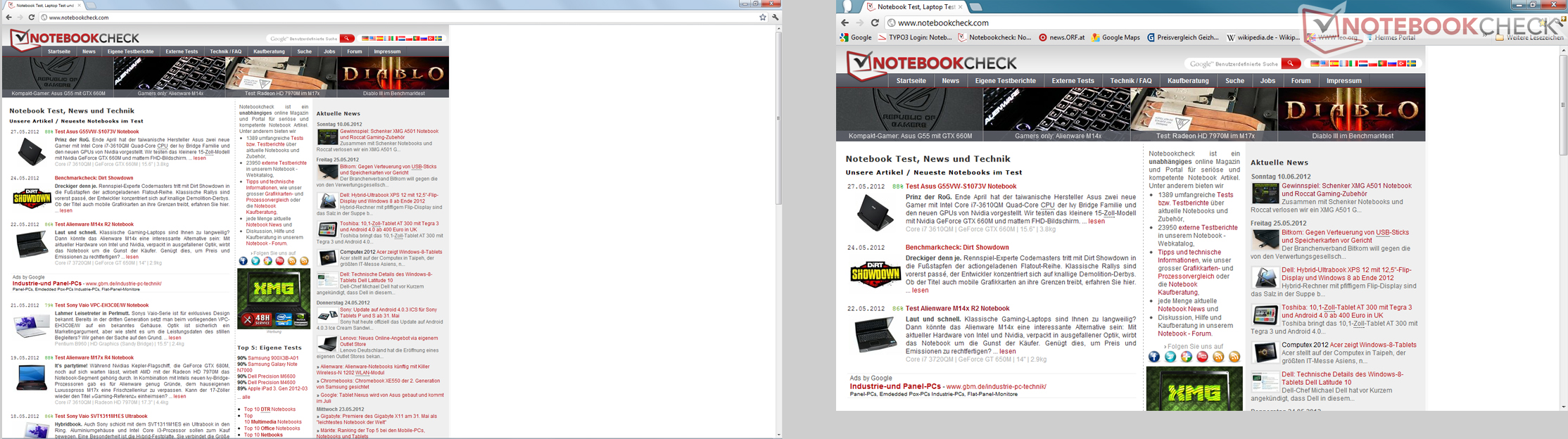 Wie gewohnt ist der letzte Punkt in der Rubrik Display die Blickwinkelstabilität. Während beim stationären Einsatz der User meist in einer fixen Position vor dem Display verweilt, sieht man sich im mobilen Einsatz oftmals ungünstigen Positionen gegenüber, an denen der optimale senkrechte Blickwinkel auf das Display nicht eingehalten werden kann. Bestes Beispiel wäre hier etwa die Benutzung im Flugzeug, wo ein weites Öffnen des Displays durch den Vordersitz in der Regel unmöglich ist.