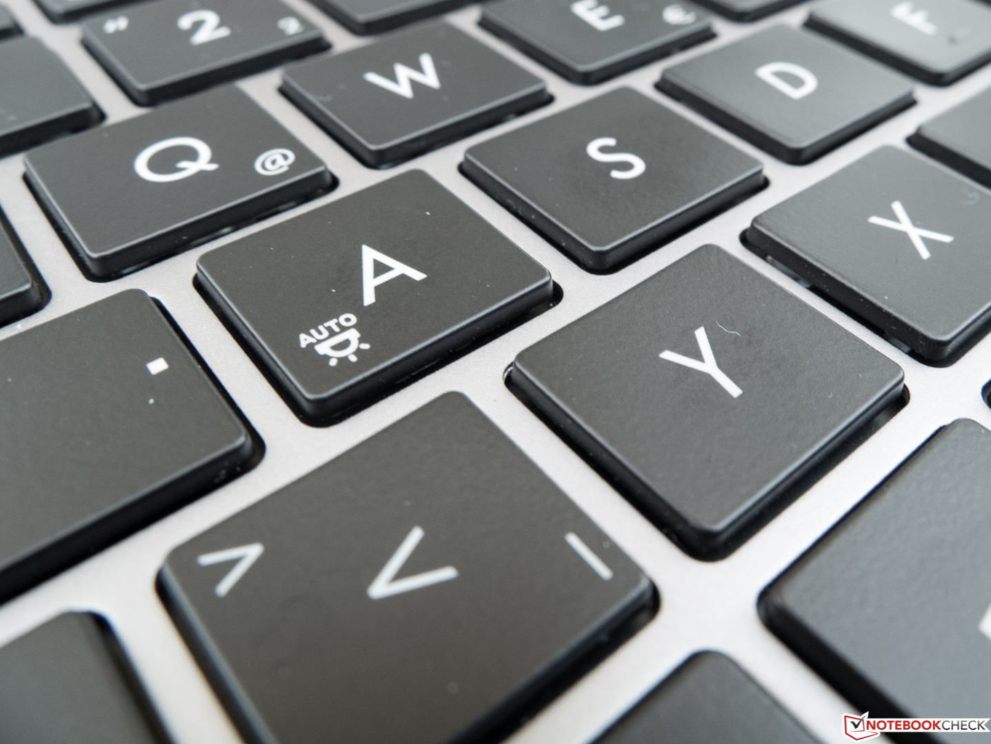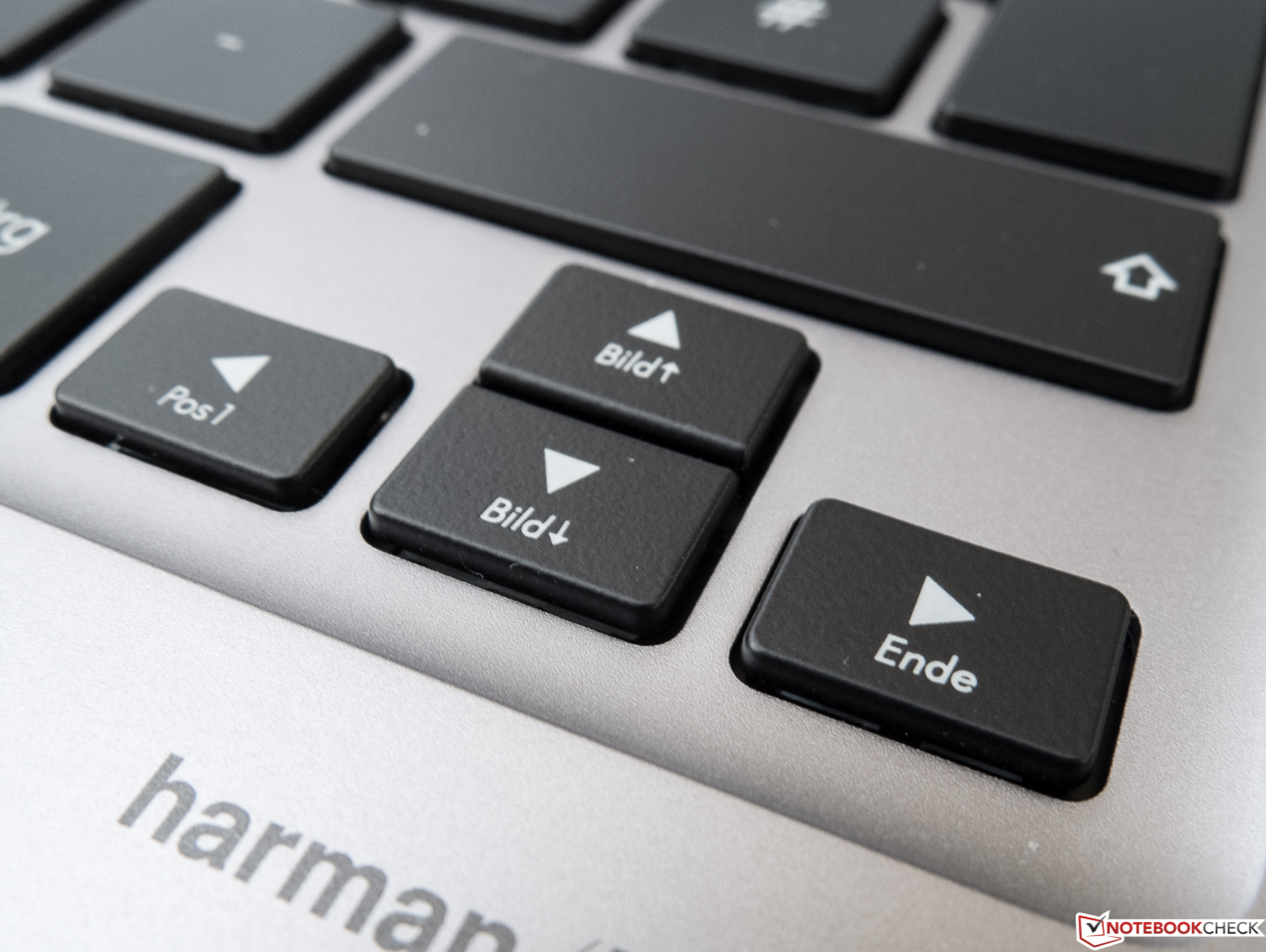 Die Breite der in drei Stufen gleichmäßig und kontrastreich beleuchtbaren Chiclet-Tastatur entspricht der von normalen Desktop-Keyboards (ohne Nummernblock). Deswegen fallen sowohl die Größe als auch der Abstand der flachen, leicht gummierten und einwandfrei beschrifteten Tasten zueinander aus wie gewohnt, was ebenso wie das weitgehend überraschungsfreie Layout ein hohes Schreibtempo begünstigt. Etwas fummelig sind die unter der rechten Shift-Taste gruppierten, halbierten Cursor-Keys ausgefallen, außerdem wurde der On/Off-Button oben rechts in die Tastatur integriert.