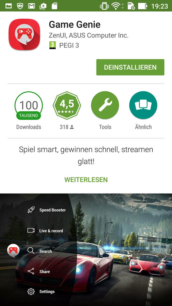 Neu in ZenUI 3.0 sind zum Beispiel animierte Hintergrundbilder und die App „Game Genie“, mit denen sich Spiele über YouTube und Twitch streamen lassen. Vorinstalliert ist auch der „Mobile Asus Manager“, eine Art Tuning App, mit der sich beispielsweise Speicherplatz freigeben, der Stromverbrauch regulieren und das Smartphone auf Sicherheitsrisiken scannen lassen. Die Tool-Sammlung umfasst auch bereits bekannte Anwendungen wie das „Laserlineal“. Diese App nutzt den Laser-Autofokus des ZenFone 3, um die Entfernung zwischen dem Smartphone und einem anvisierten Objekt zu messen. Das klappt jedoch nur auf kurze Distanzen bis 1,5 Meter.
