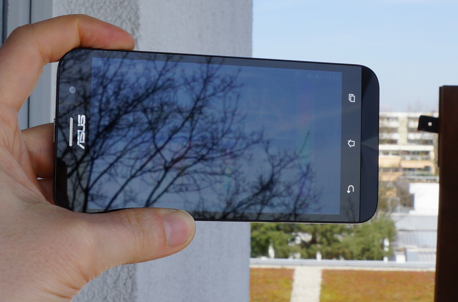 Die Blickwinkel sind gut: Auch bei der Betrachtung von der Seite sieht man den Bildschirminhalt noch sehr deutlich, leichte Farbverschiebungen gibt es aber. Im Freien ist die spiegelnde Bildschirmoberfläche ein Problem. Der Bildschirminhalt ist im Schatten noch recht deutlich sichtbar, in hellen Umgebungen muss man allerdings die Augen schon sehr anstrengen, um noch etwas zu erkennen.