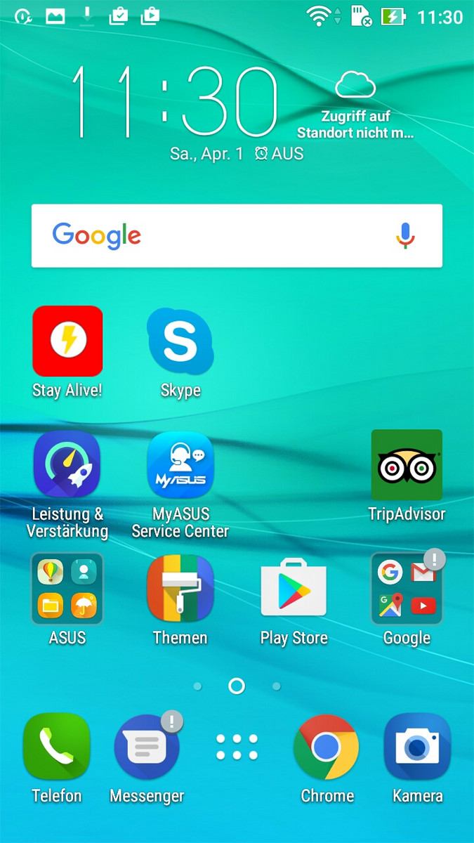 ZenUI heißt Asus' hauseigene Nutzeroberfläche, die auf Android basiert und auf den ersten Blick nur wenige und hauptsächlich optische Änderungen an Googles Betriebssystem Android 6.0 vornimmt. Erfreulich ist, dass es gleich nach dem Start unseres Tests ein Software-Update gab, Asus kümmert sich also scheinbar auch um seine günstigen Smartphones. Nach dem Update datieren die Android-Sicherheitspatches auf den 1. März 2017 und sind damit topaktuell, sehr gut, Asus.