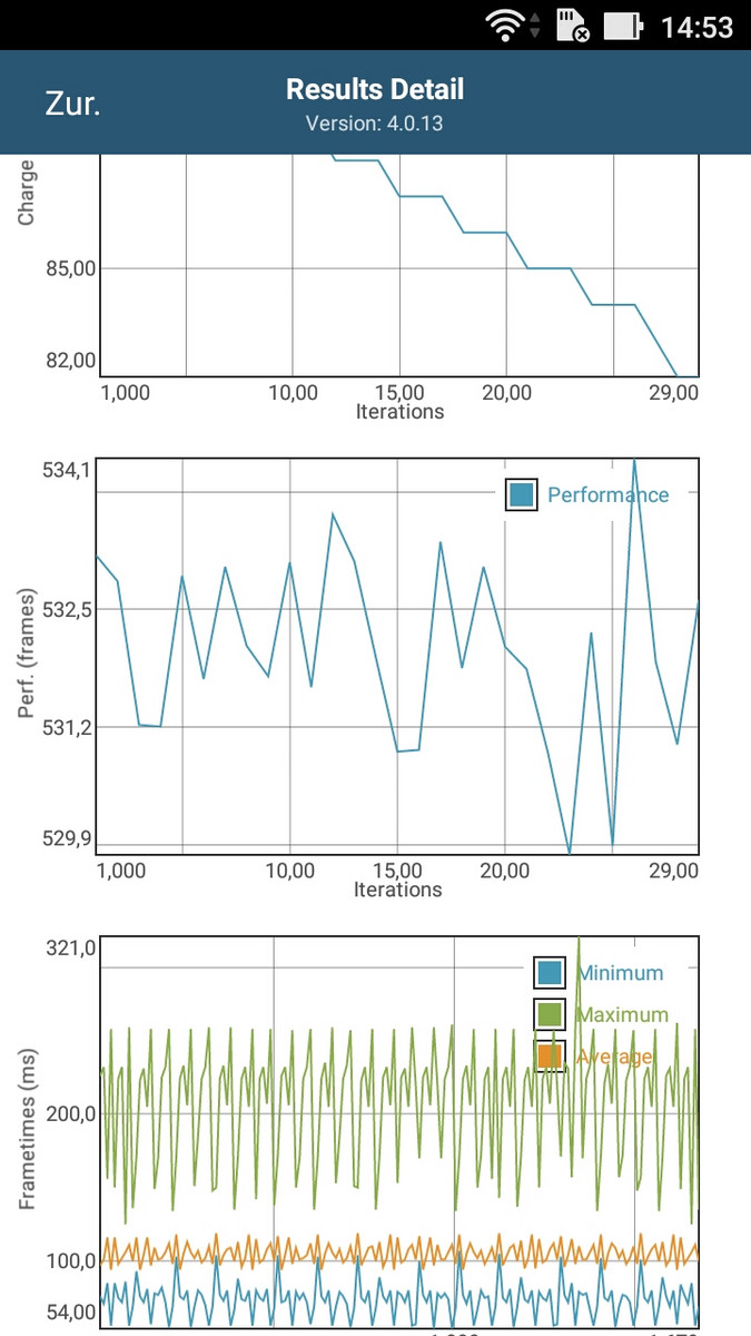 Unter längerer voller Last ist die Performance gleichbleibend, wie wir mit dem GFXBench Akku-Test feststellen können.