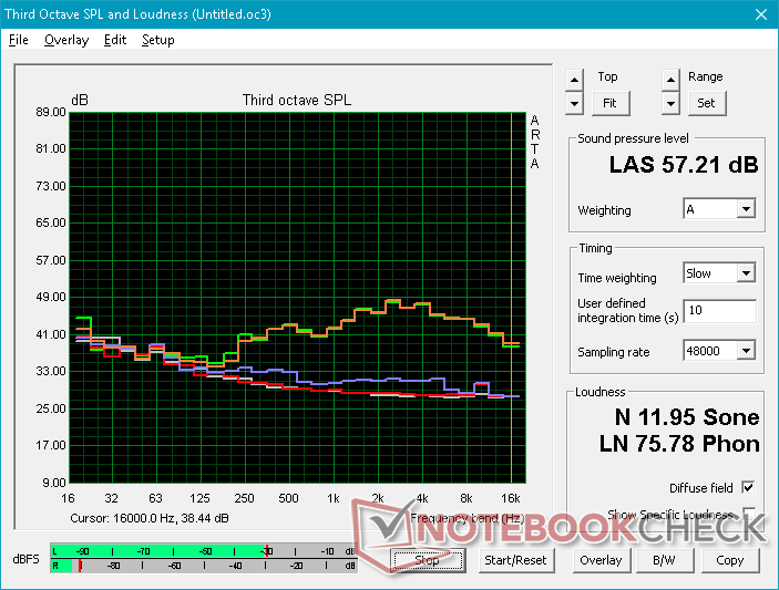 Die 2-W-Stereo-Lautsprecher sind akzeptabel und können Mitten und Höhen für ein so schlankes Gerät ausgeglichen wiedergeben. Wie bei den meisten anderen Laptops erreicht unser Testgerät bei etwa 250 Hz seine Grenzen. Möglicherweise würde ein dedizierter Subwoofer die Bass-Wiedergabe verbessern.