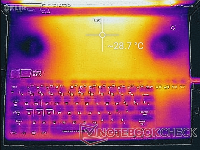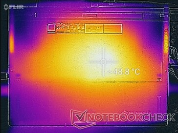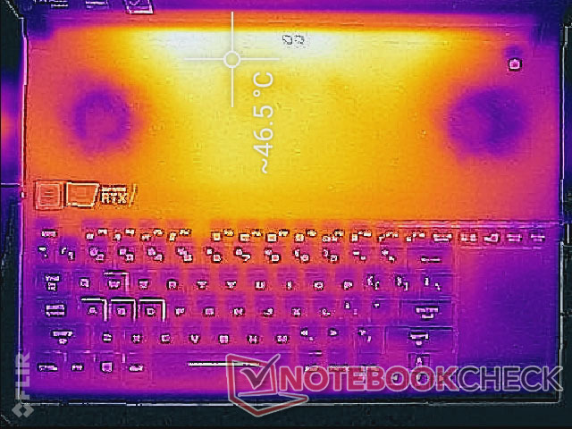 Im Witcher-3-Test erreichen die Oberflächentemperaturen bis zu 46 und 49 °C. Diese Hotspots befinden sich zum Glück nicht in der Nähe der Tastatur. Beim Razer Blade 15 hingegen kann die Tastatur unter hoher Last bis zu 42 °C erreichen.