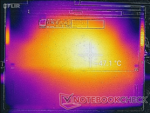(-) Die maximale Temperatur auf der Oberseite ist 47 °C. Im Vergleich liegt der Klassendurchschnitt bei 40.4 °C (von 21.2 bis 68.8 °C für die Klasse Gaming).